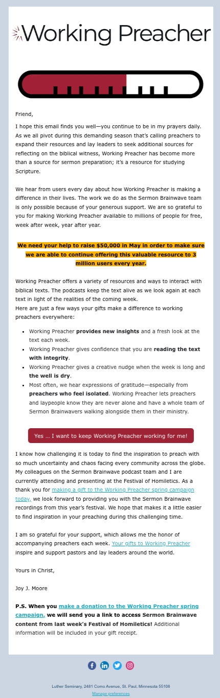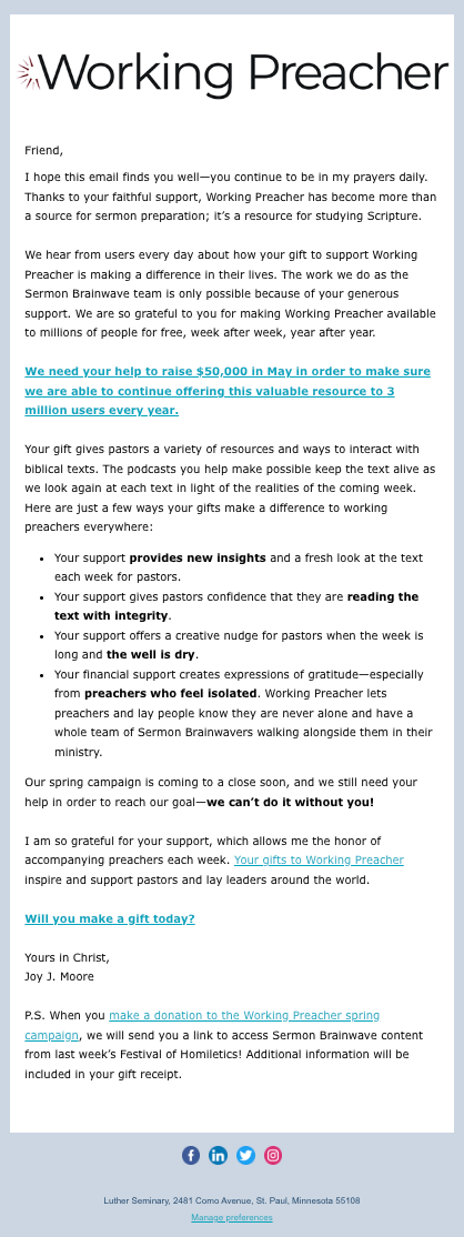 Luther Seminary ran their bi-annual Working Preacher campaign in the spring of 2022, and we wanted to test how deriving impact back to the donor instead of the organization would impact the results of one email.
