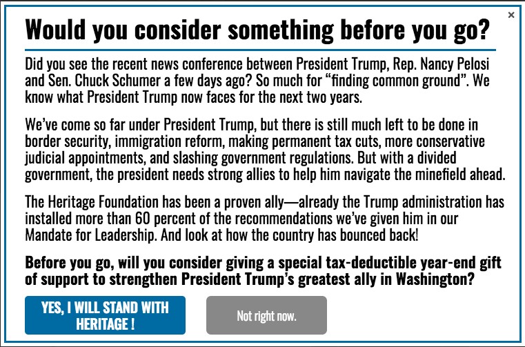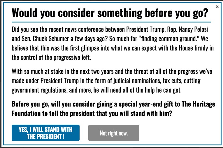 On The Daily Signal’s year-end fundraising page in 2018, we installed an exit popup with two messages, where one was focused on “Stand with the President” while the other was “Stand with Heritage”.