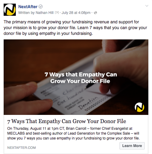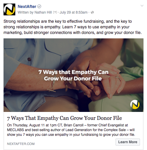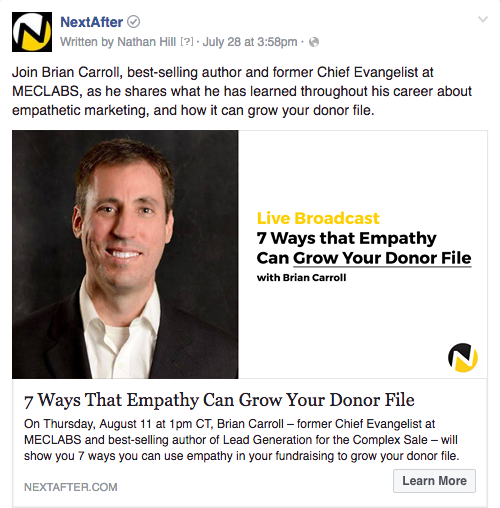Our original live broadcast Facebook Ad focused on the speaker and the title, but we thought people may be more motivated by different aspects of the focus topic. For the treatments, we developed an ad that focused on “Growing Your Donor File” and one that focused on “Empathy.”
