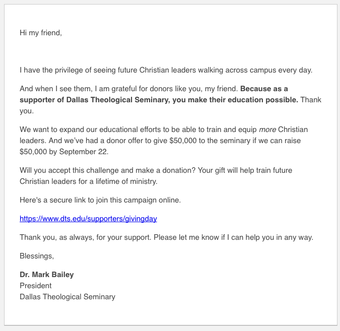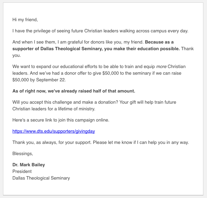 Dallas Theological Seminary was raising money in honor of North Texas Giving day, and had a group of donors pledge $50,000 if they could raise $50,000 in a week.