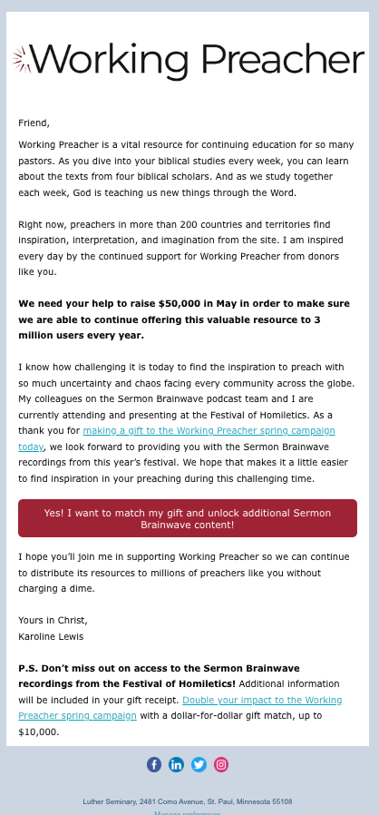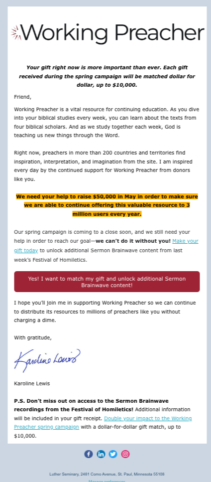 Luther Seminary ran their bi-annual Working Preacher campaign in the spring of 2022, and we wanted to test how distinguishing between the two topics in an email (the match for the campaign first, then the free content offer, Sermon Brainwave next) would affect the conversion rate.