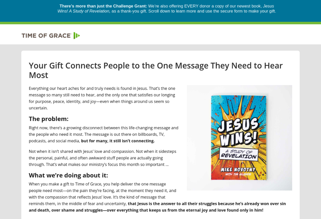 During Time of Grace’s May Challenge Grant, we hypothesized that a sticky bar calling out the book premium available to every donor would increase the conversion rate.
