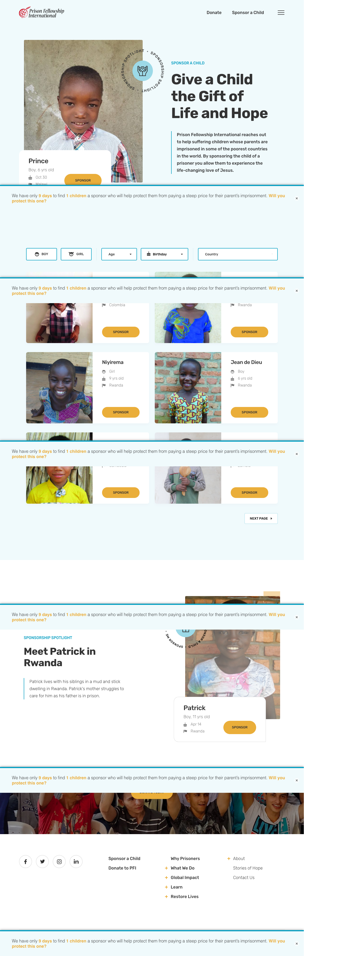 During their calendar year end campaign to acquire sponsors, we tested a sticky bar with a countdown to see if it would increase sponsorships. The control had no sticky bar. The test counted down both days left to acquire sponsors and the children left who needed sponsors. It was placed on sponsorship pages to increase motivation and reinforce value proposition.
