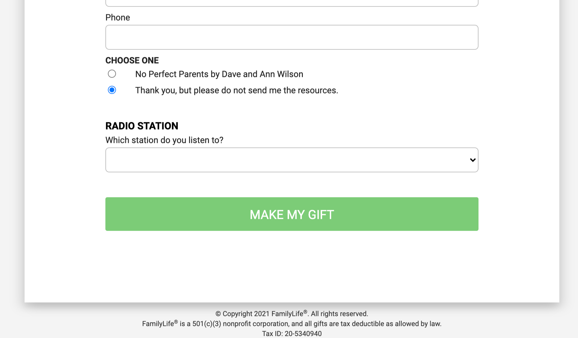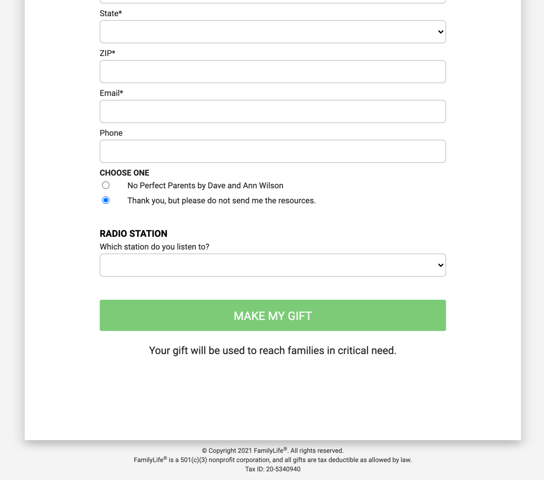 FamilyLife was offer a premium book on parenting for a gift of any amount. The audience comes because of their interest in the book, but they also learn about how their gift to FamilyLife will help families that are broken or hurting. So we tested including that value prop underneath the donation submission button to see if in the moment of decision, reinforcing the fact that the donor doesn’t just get a book but helps families in critical need. This was run on a Facebook acquisition offer.
