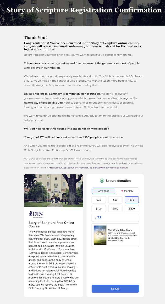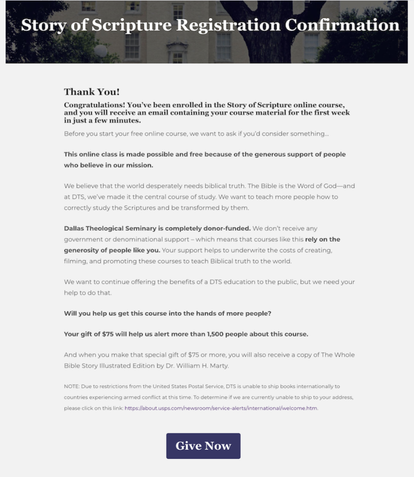 Dallas Theological Seminary recently switched donation platforms. The new default donation page has the “Give Now” button embedded and when the button is clicked the form pops up. We wanted to test embedding the form and skipping the button on the page.
