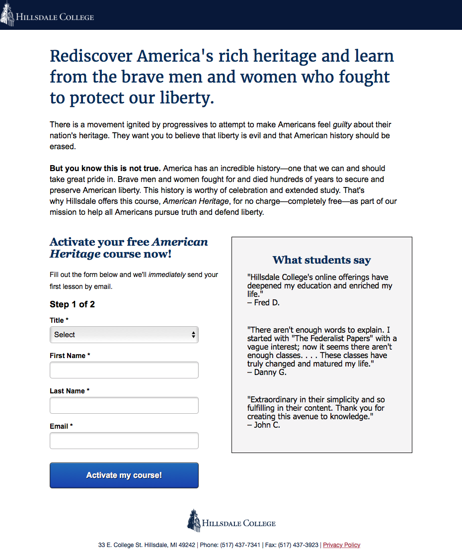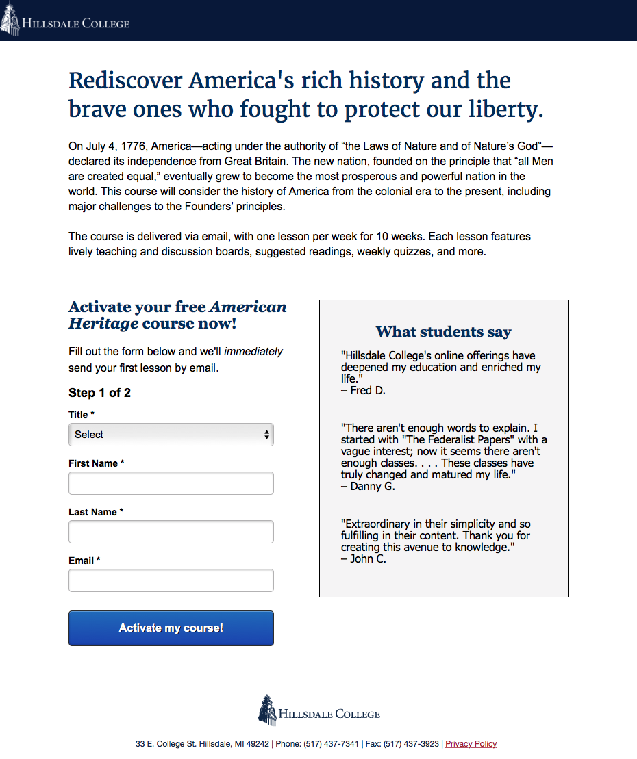 Hillsdale College previously found that using an emotive headline on their American Heritage course signup page increased email acquisition by 168%. This success taught a valuable lesson about landing page headlines: It is better to orient the language around what the course does for the user, rather than a particular belief. They were curious if the same principle applied to landing page copy below the headline. They created a treatment and launched a test to find out.