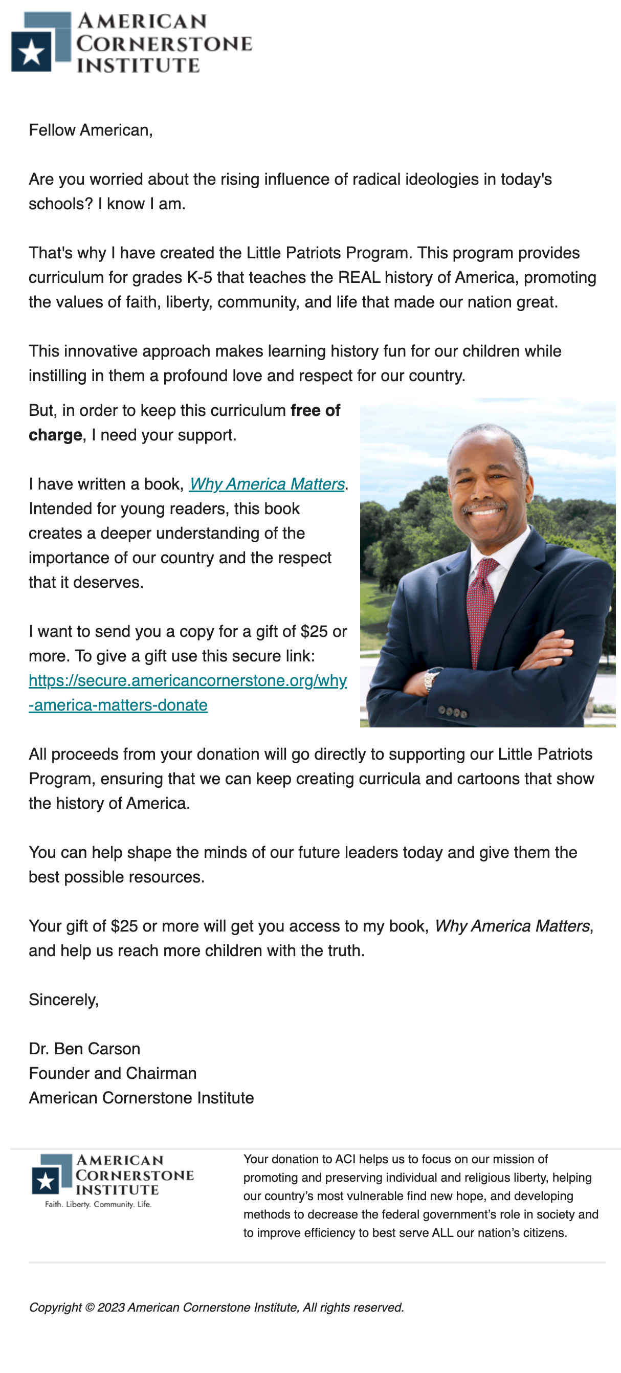 American Cornerstone Institute had previously learned from experimentation that using their figurehead, Dr. Ben Carson, in their marketing helped improve conversion. But as they offered their new resource “Why America Matters”, if using Dr. Carson actually obscured the product that people would receive if they gave a gift — the book. They decided to test against their previous learning and see showing the book improved conversion.