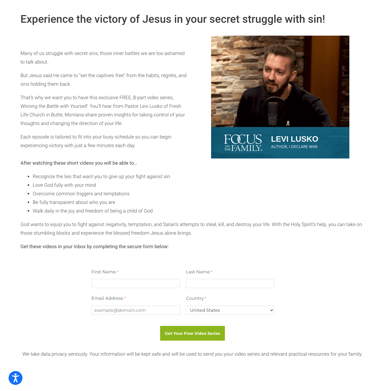 We created a treatment version of their Winning Your Inner Battles video series landing page where the bullet points stated what subscribers would now be able to do, because of these short videos. We split traffic 50/50 and ran the experiment for 2 weeks. We believe that this new language would increase the perceived value of the videos, leading to more signups on the page and a higher downstream donor conversion on the subsequent donation page.