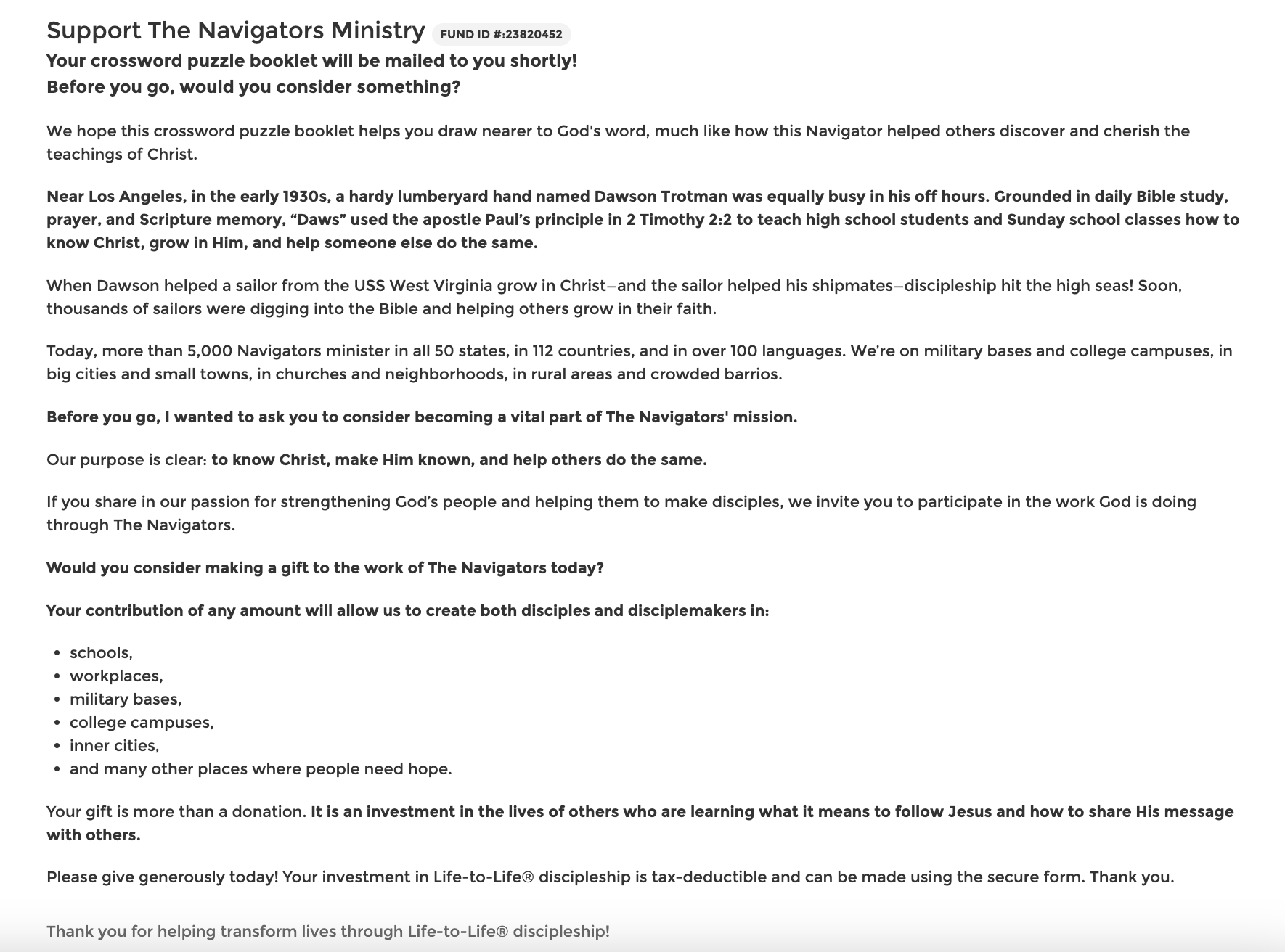 In an effort to increase donor conversion metrics on The Navigators Crossword Puzzles Content Offer, we decided to run an A/B test split 50/50. With previous offers, we have seen a positive lift in transactions and revenue when calling out the impact of a gift. Therefore, we expected to see similar results on this test.