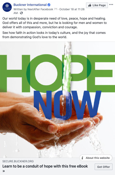 Buckner International was running an acquisition campaign to promote their new ebook, Hope Now. In the initial launch of the campaign, we tested two different ad approaches- one that focused more on the value and meaning behind the book, and one that focused more on language specifically around getting their free copy of the book. Imagery was the same.