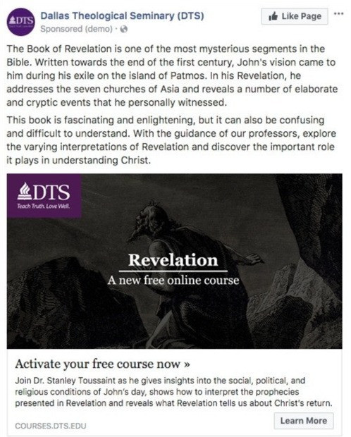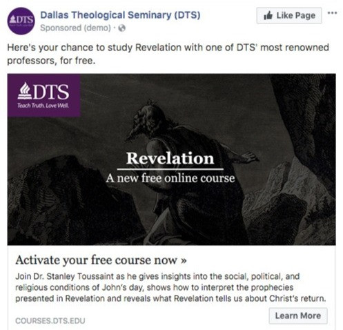 Dallas Theological Seminary was promoting their online course Revelation when they noticed an opportunity to test. In their original Facebook course promotion ad, they called on viewers to ‘study with one of DTS’ renowned professors, for free.’ Through previous message testing, they’ve seen that this is a strong value proposition for a lot of their online resources and material. However, they wondered: Will a stronger focus on the book being studied (i.e. Revelation) and its complexity increase motivation and email acquisition rate?