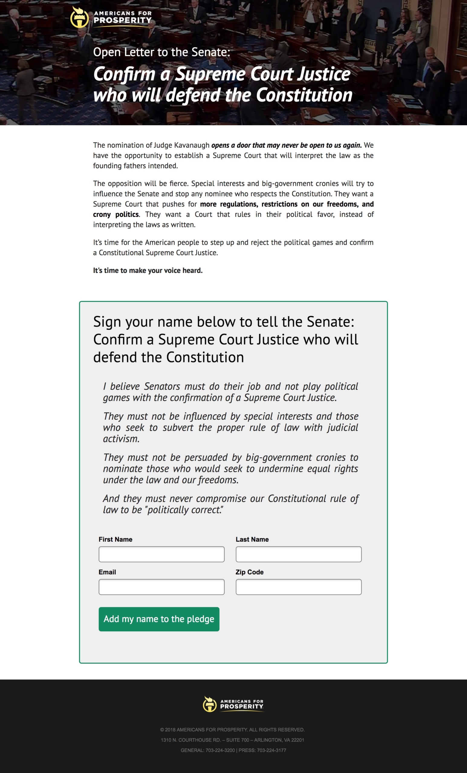 Americans for Prosperity was running an Open Letter to the Senate for the upcoming Supreme Court confirmation hearings. As part of the process, the visitors were asked to sign a statement of belief and were then presented with an opportunity to make a gift. With an email acquisition rate above 60%, our previous experiments had found it difficult to improve the email acquisition page.