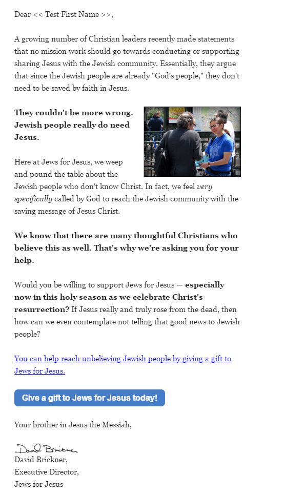 Jews for Jesus had a process in place to convert direct mail letters to eAppeals, which they sent on a monthly basis to their email file. While this raised money and kept digital donors engaged, they hypothesized that the tone of a direct mail piece wasn’t really aligning with the medium of email.