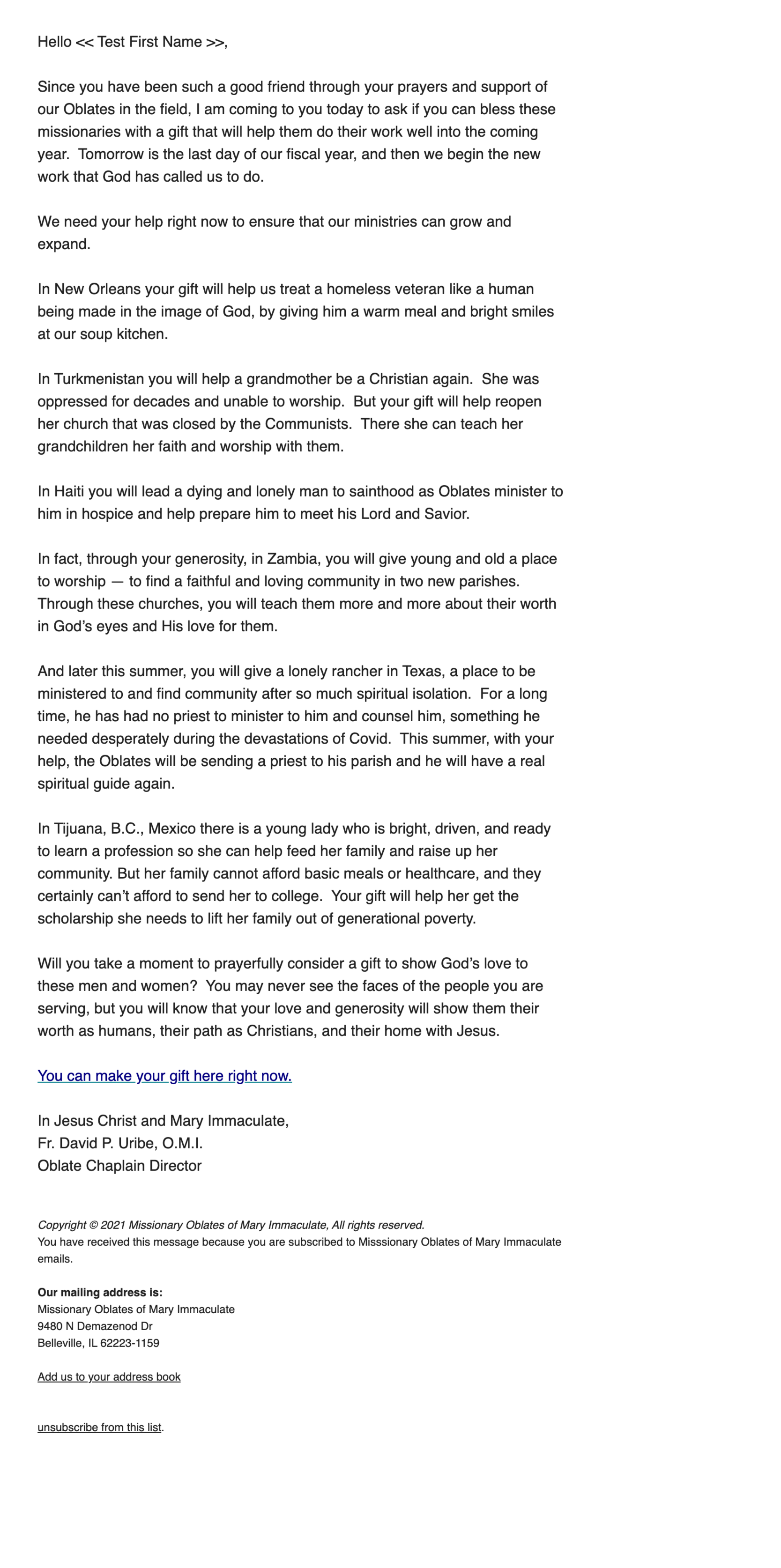 During Oblates fiscal year end campaign, we wanted to test identity language that clarified the identities of the people that would be helped by a donation to the campaign. Instead of saying, you will help people in Zambia, we told the story of one person in Zambia that would be helped. This sent on the second to last day of the campaign and was done as an A/B test in Mailchimp.