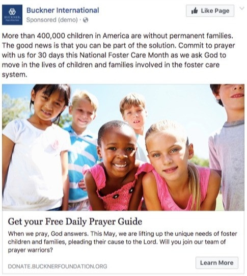 Buckner International was promoting a new devotional to grow their email file targeted towards people interested in the foster care system. They wanted to figure out what made people click through from the ad and download the guide. They created four different treatments to test this- 2 images paired with 2 different approaches to copy. One of the images is a photo of the 3D eBook, and the other image is a photo of children. The copy differences hinge on a direct vs. soft ask: “commit to prayer” vs. “learn more about the opportunity”.