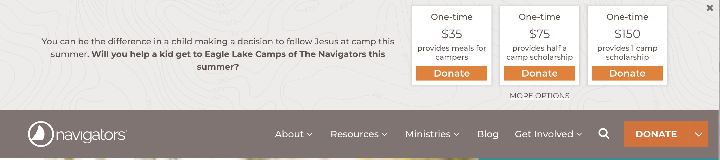 For The Navigators’ April Eagle Lake campaign, we tested adding impact callouts to each gift array amount on the pushdown. When a donor selected a gift amount, that amount was automatically pre-selected on the donation page, where the corresponding impact message was reinforced in the copy—creating a more seamless and compelling giving experience.