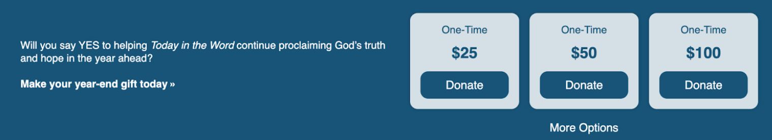We believe that adding gift array buttons to a lower third for Today in the Word homepage visitors will achieve an increase in donor conversion metrics because it allows the users to already begin the process of giving by selecting a gift amount before they even arrive on the donation page.