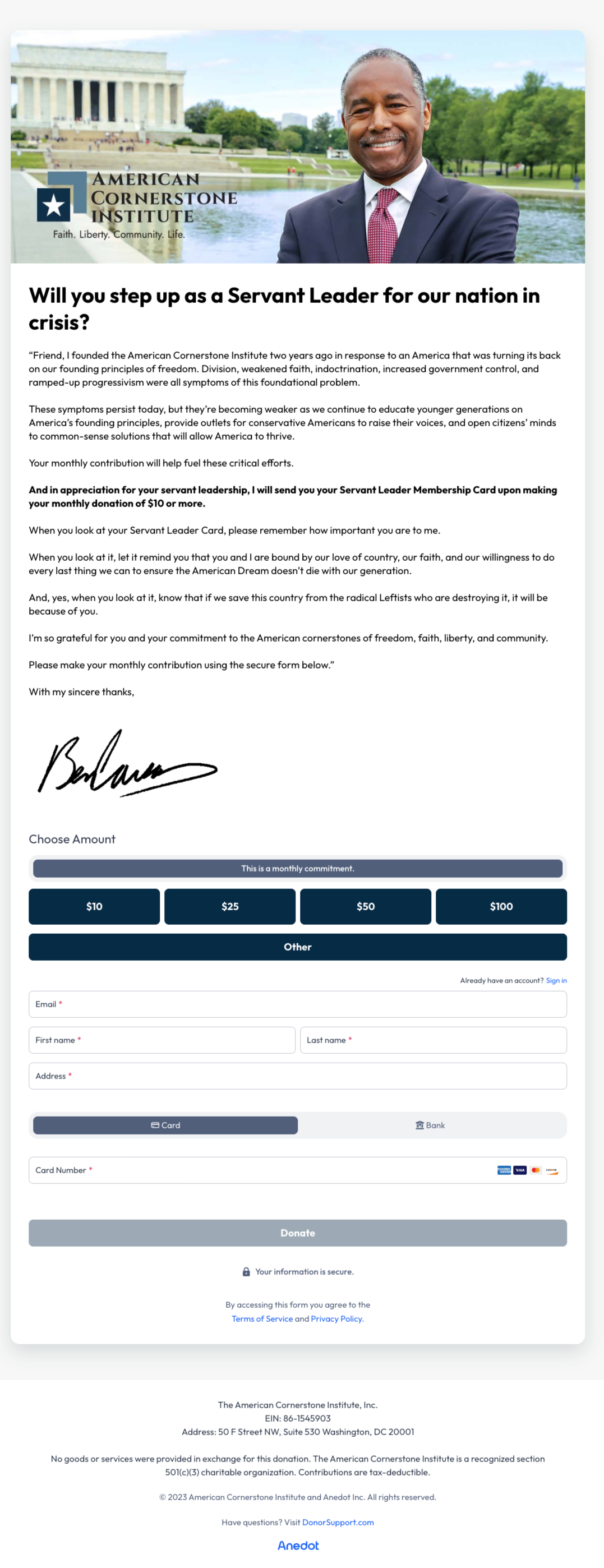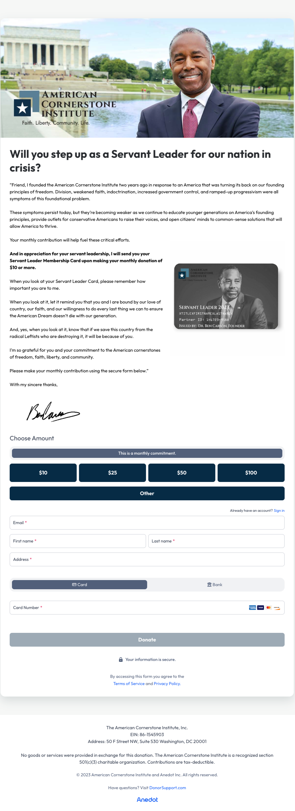 We were running a monthly upgrade ask to existing donors on the housefile and wanted to offer a special premium for those that chose to convert. We know that sometimes adding images to a donation page can cause additional friction, but we also believed adding a specific image previewing the premium that monthly donors would receive might increase clarity and appeal for this offer. So we split traffic 50/50 between the control page with no image and the treatment page that added an image of the membership card that would be available to those who made a recurring gift on the page.