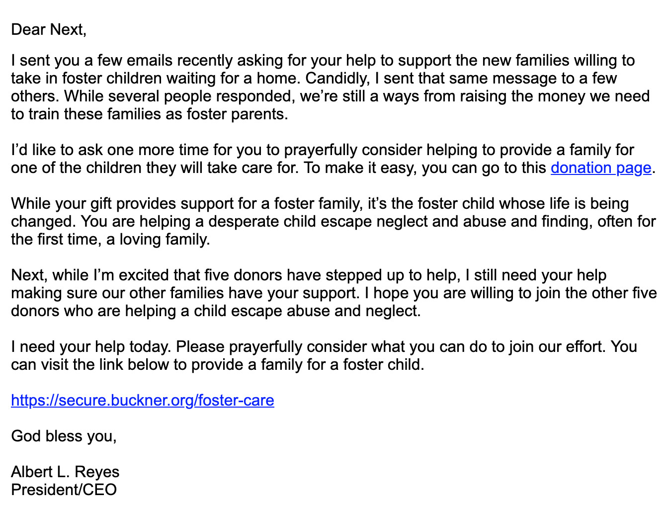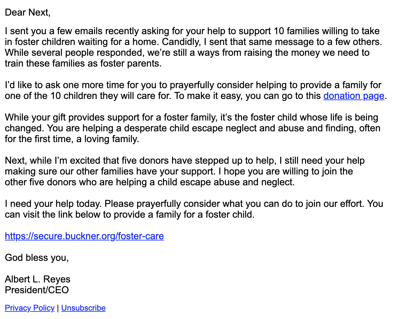 Buckner International was running an appeal around providing scholarships to foster children in order to go to camp. In the past, we had observed increased results when we used small, tangible goals in our appeal but it had never been tested directly. We decided to run a head-to-head test for this campaign to understand the impact of using these small goals with the Buckner donor file.