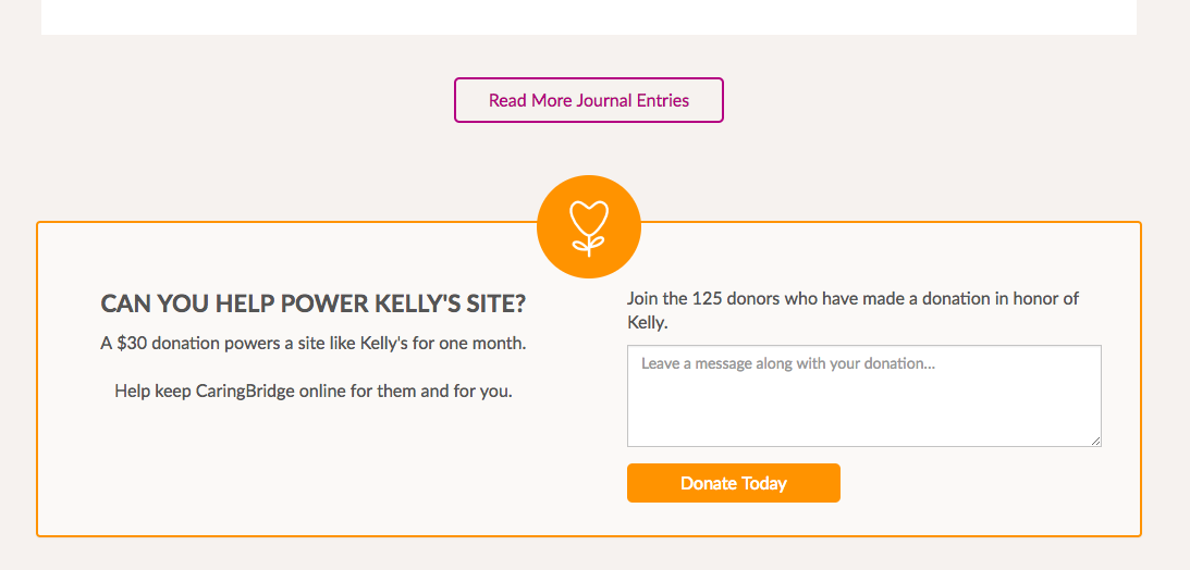 CaringBridge had long sought to increase clickthrough rate on their tribute widget, which started the gift process for . One of their designers hypothesized that the current tribute widget blended in too much with the rest of the site and needed some “pop”. Using the intense CaringBridge brand purple, she created a treatment designed to attract more attention, and hopefully clickthrough rate.