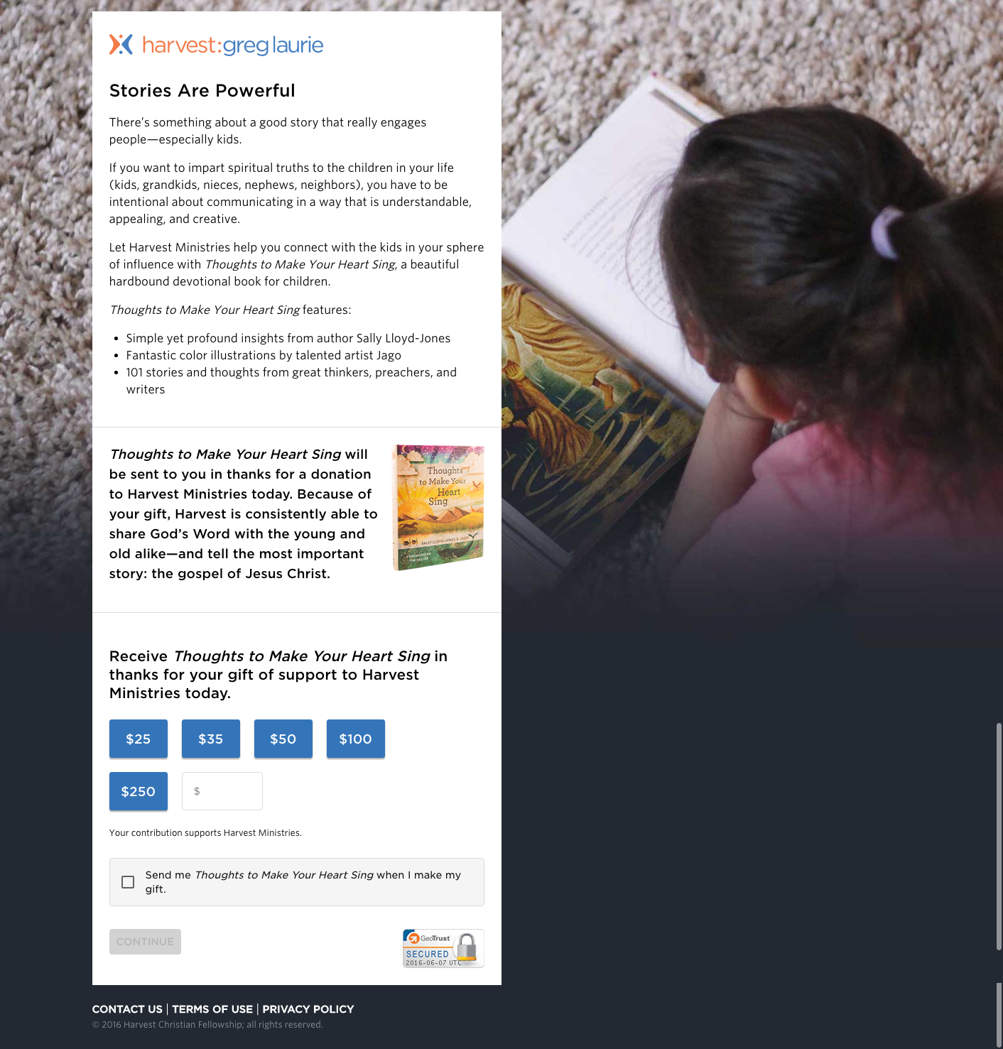 Harvest Ministries promoted their midmonth premium offer for the month which was, Thoughts to Make Your Heart Sing by Sally Lloyd-Jones. The email pushed people to the landing page to get the premium.