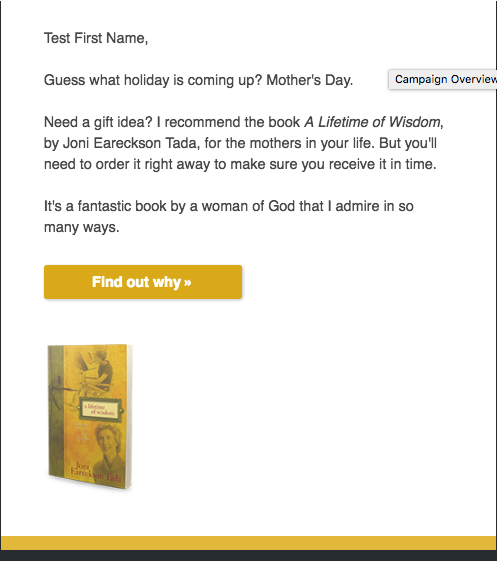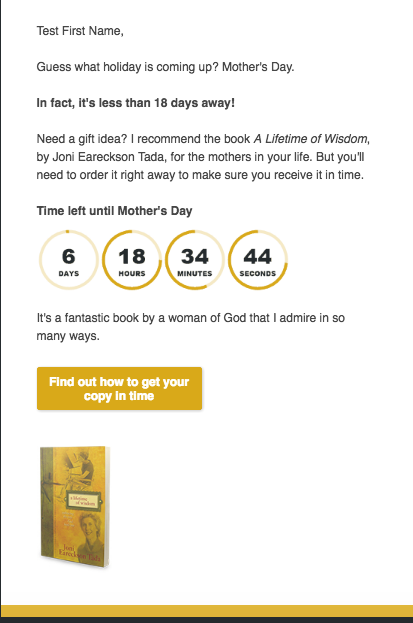 Harvest Ministries was sending a mid-month update on their fundraising appeal for the month. The offer was a book by Joni Earackson Tada. The control email highly incentivized the click by asking the reader to “find out why” the sender (Greg Laurie) admires Joni, the author of the book. While this might drive a lot of clicks, we’ve seen this approach drive much lower conversion rates, as those who click through are not as motivated to accept the offer.