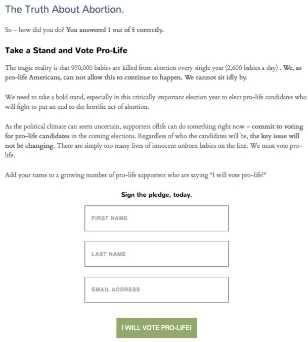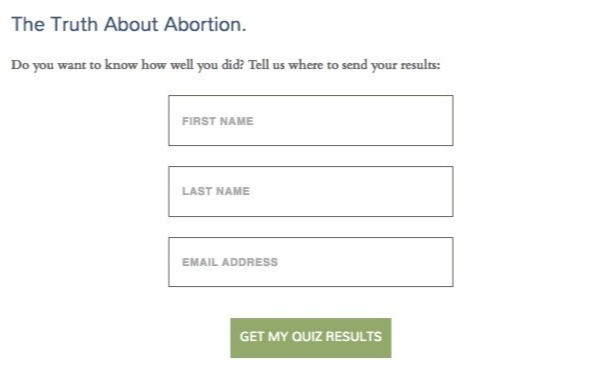 Susan B. Anthony List developed an online quiz called the “Truth About Abortion”. This was a five question quiz that tested and educated people on facts about abortion. At the end of the quiz, a person would get their results. In efforts to optimize name acquisition, they tested this part of the funnel by creating two different ways to acquire a persons name: