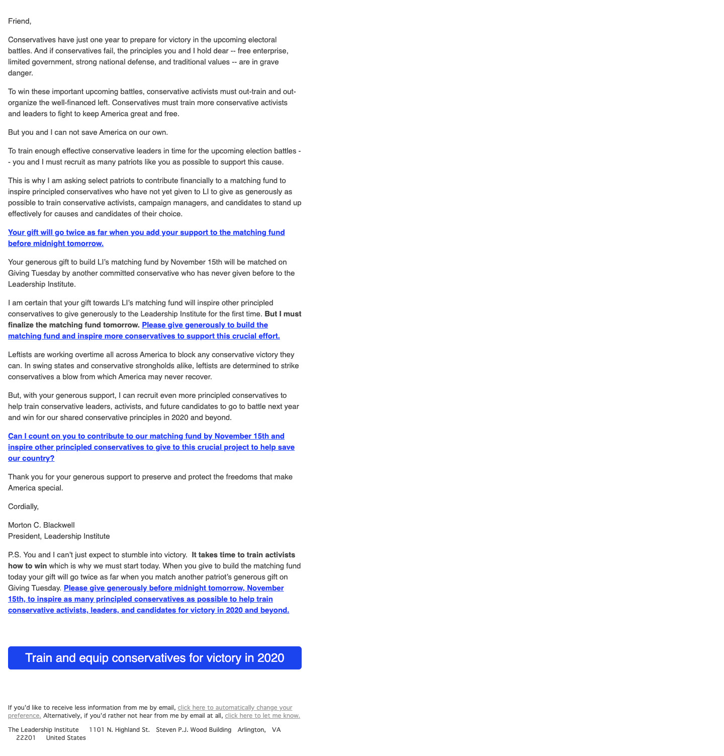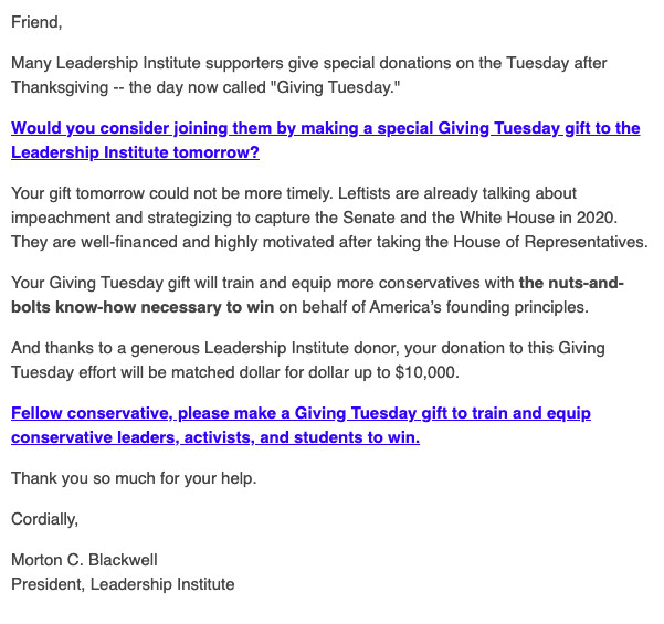 Leadership Institute was running a special “pre-Giving Tuesday” campaign as the initial part of their year-end campaign. The team wanted to test whether offering donors the opportunity to contribute to a matching gift would inspire more generosity, as opposed to a traditional matching gift as an incentive (as had traditionally been done). They developed two series of emails and split donors by previous giving amounts to run each through a three-email campaign leading up to Giving Tuesday to determine which approach resulted in more gifts and revenue.