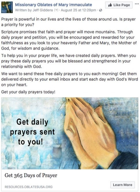 The Missionary Oblates were running a free offer to get a daily prayer emailed to your inbox. They wanted to test whether shorter, more direct ad copy would affect conversion rate. All other elements of the ad remained the same.