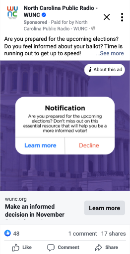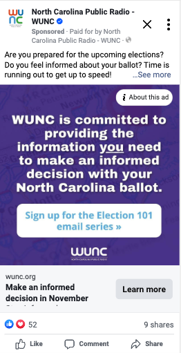 This experiment, conducted for WUNC, a radio station based in North Carolina, involved a targeted Facebook media campaign designed to evaluate a novel approach. Our objective was to determine whether localizing the ad creative and directly addressing the target audience, coupled with a clear call to action, would enhance the rate of completed registrations.