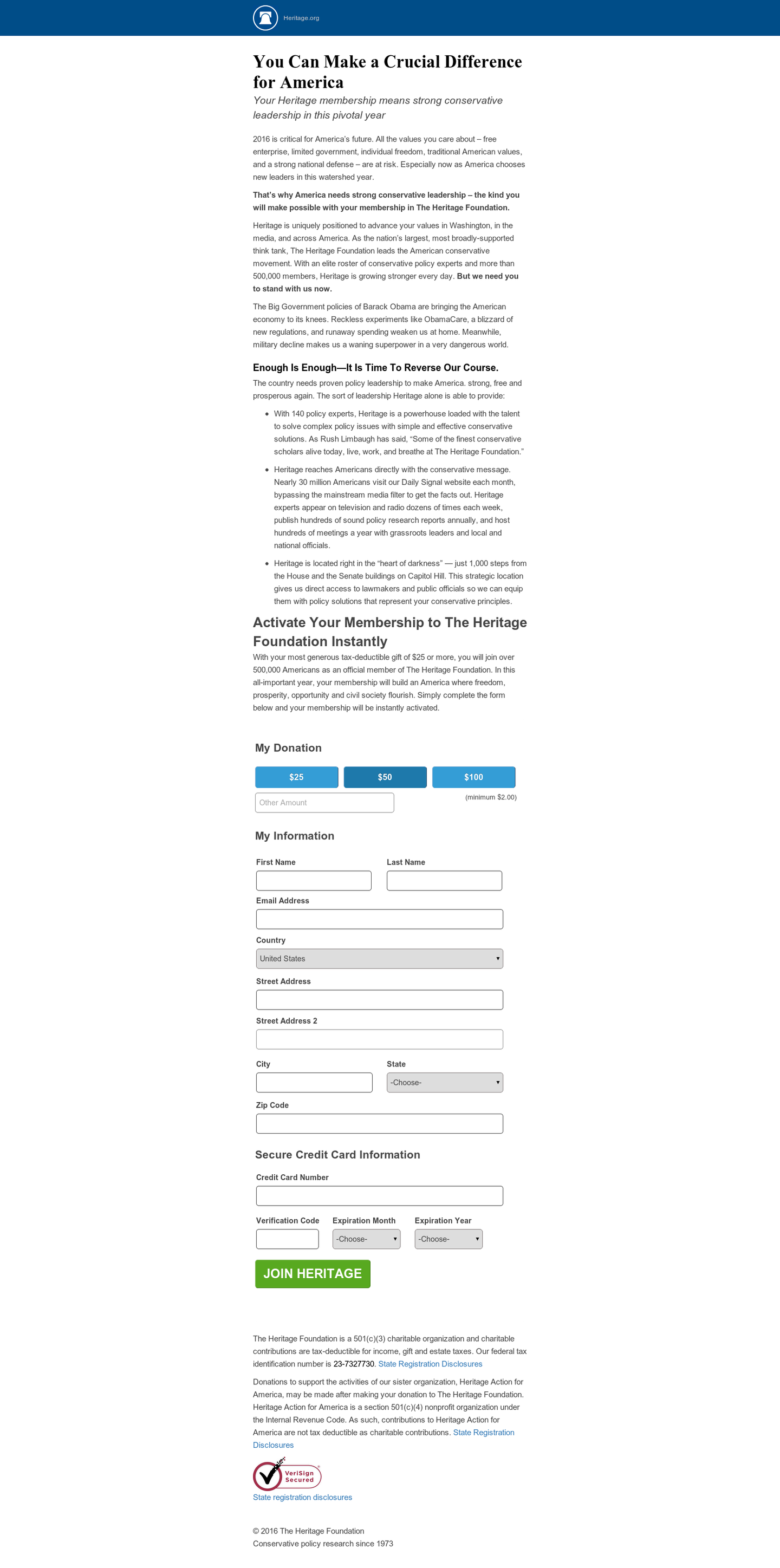 As part of their January membership campaign, The Heritage Foundation wanted to determine what factors were the biggest motivators for new members. Every member receives a handful of benefits such as newsletters, a membership card, and important updates. We wanted to find out if, by describing these benefits on the page, we could increase the perceived value of the membership. We decided to create a treatment that identified and explained each of these benefits in detail to potential new members. Once finished, this treatment ended up doubling the length of the page with the added copy.