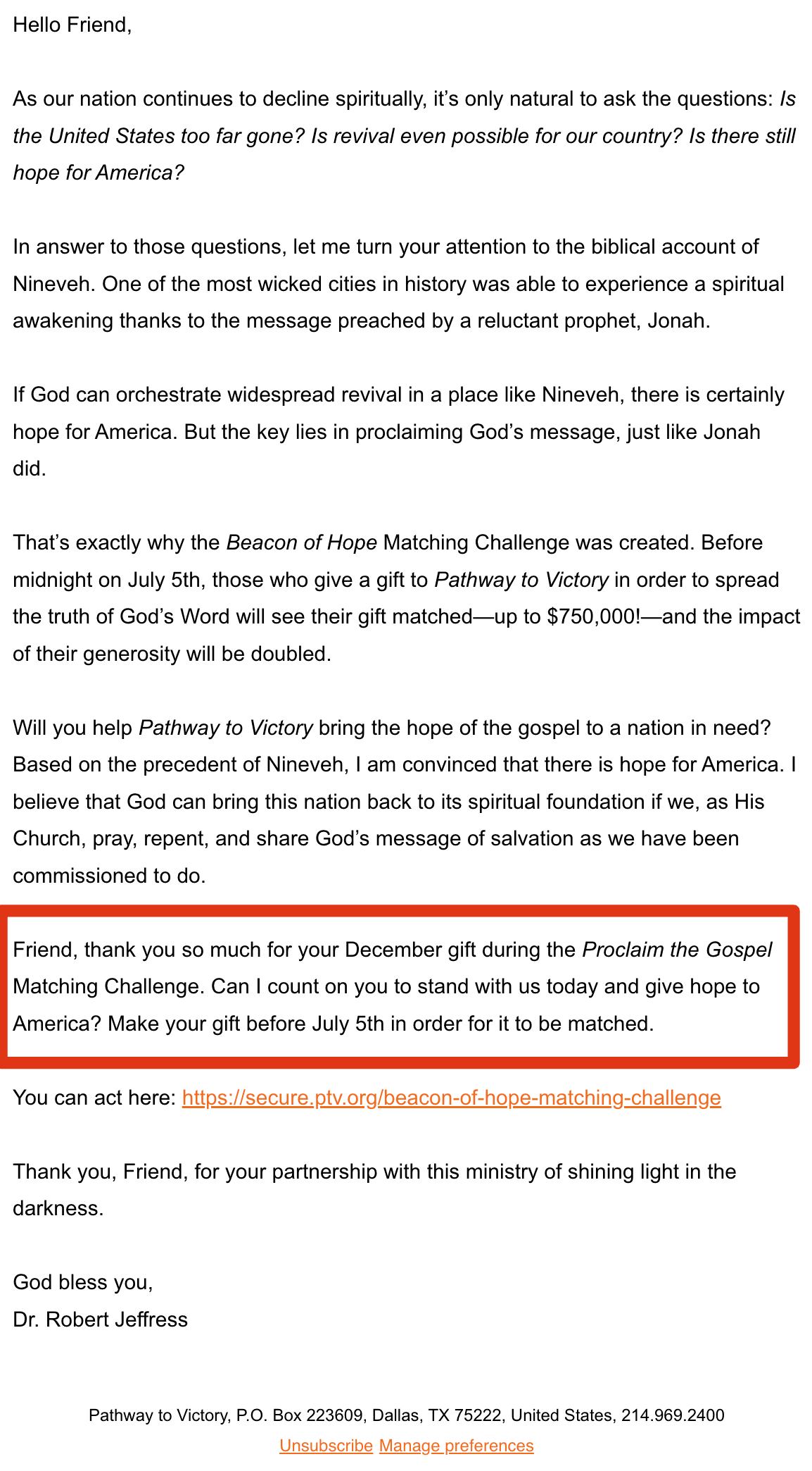 For the June 2024 campaign, we decided to test with the segment who made a gift during the December 2023 campaign to see if by mentioning their gift in December would encourage them to donate again in June.