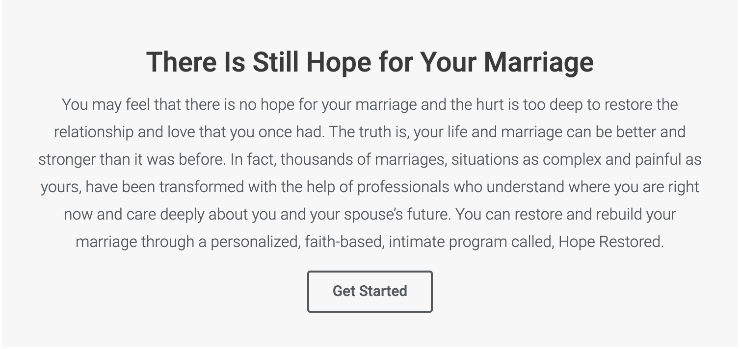 One of the top lead generators for Hope Restored names is the CTA at the bottom of marriage crisis articles on focusonthefamily.com. The copy for the current CTA has been tested into, but now that we have more options for imagery through WordPress, we wanted to see what the addition of an image would do to the conversion rate. We measured this test by clicks alone.
