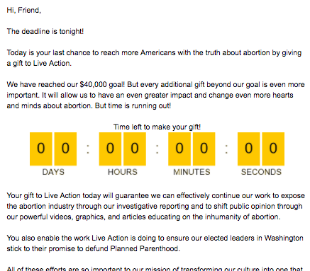 Towards the end of Live Action’s money bomb, they met their goal. This was great news! They still had two emails left to send in their campaign and we questioned that donors might be less motivated to give if they knew we had already met the goal. We tested this. For the control, we mentioned that we had reached our goal but still needed their support. For the treatment, we didn’t mention we met the goal, but emphasized that time was running out for them to make their gift.