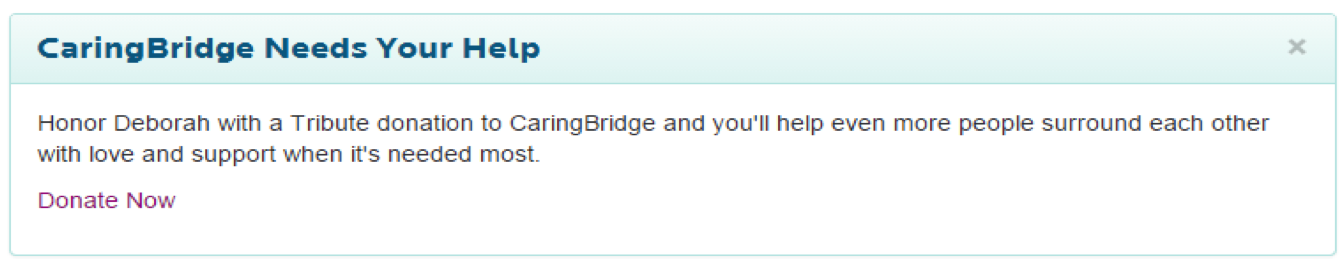 During appeals, CaringBridge often displays an additional site banner on its journal pages to present a donation ask to the reader. We believed that increasing personalization by including mentions of the patient’s name along with a more emotional ask would cause more people to click the link and begin the donation process.