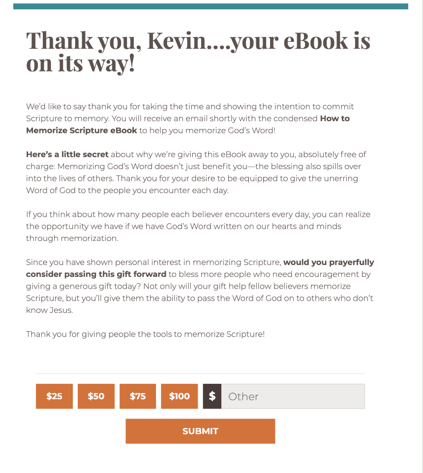The Navigators were promoting a free eBook about Scripture memory. While the offer was doing well in acquisition, they felt that the donation page conversion rate could be increased through optimization. They had seen experiments where personalizing the page (since the visitor had just given them personal information) might increase conversion. To this end, they added “Thank you, FirstName” to the headline. Then, they looked at the value proposition presented to the visitor after accepting the free eBook. The language on the control donation page was somewhat abstract—after promising to deliver the eBook, it went into an explanation of disciplemaking, and then made a very transactional ask to the donor: “A gift of $50 means that 2,000 people can see this eBook.”