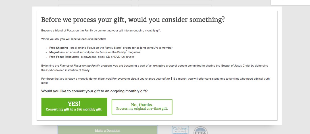 On Focus on the Family’s main donation page, we hypothesized that we might be able to increase revenue and the number of recurring gifts by offering people the opportunity to turn their one-time gift into a recurring gift right at the moment of the transaction. To do this, we created a pop-up that appeared right after a person clicked on the “Make a Donation” button and before the gift was processed that asked them if they would like to make their donation a recurring gift instead. The pop-up had value proposition on it for why they should become a recurring donor and lowered the gift amount to be 60% of what their original one-time gift was. A person would either click, “No, make my original gift” or “Yes, make my gift recurring”.