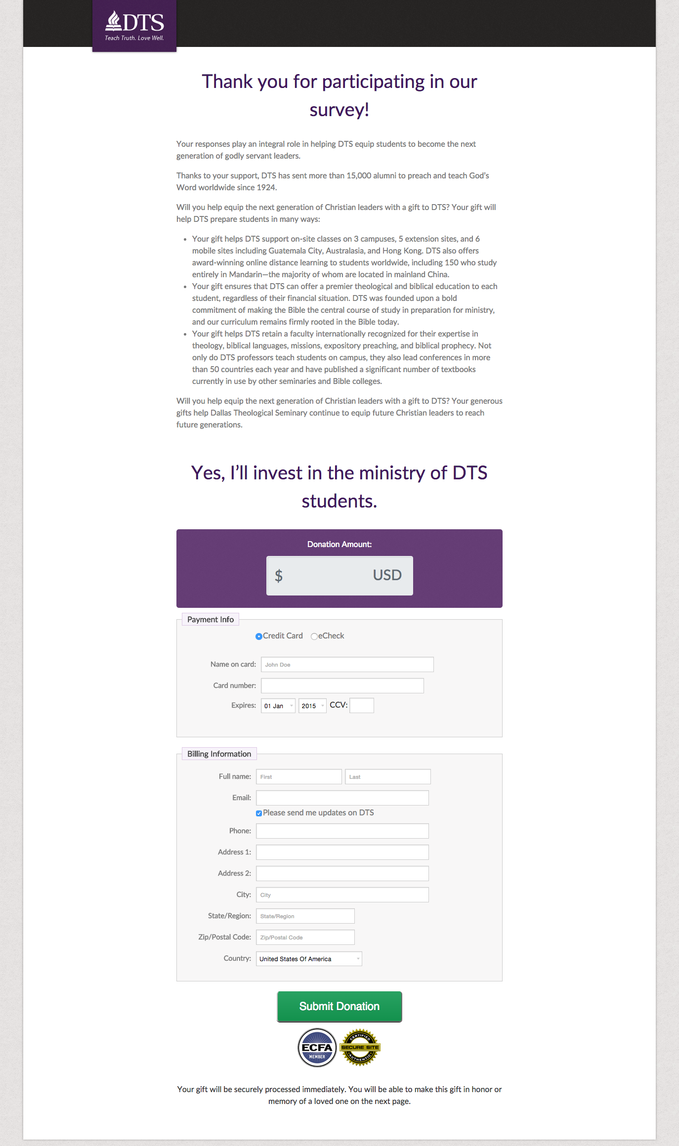 Dallas Theological Seminary sent a survey to their donors and prospects to better understand what they valued most about the organization. The survey was immediately followed by a donation ask. DTS hypothesized that after completing the survey, donors wouldn’t need as much copy to be convinced to make a gift. So they developed a treatment landing page that removed much of the copy — which to a highly motivated donor, could pose as friction.