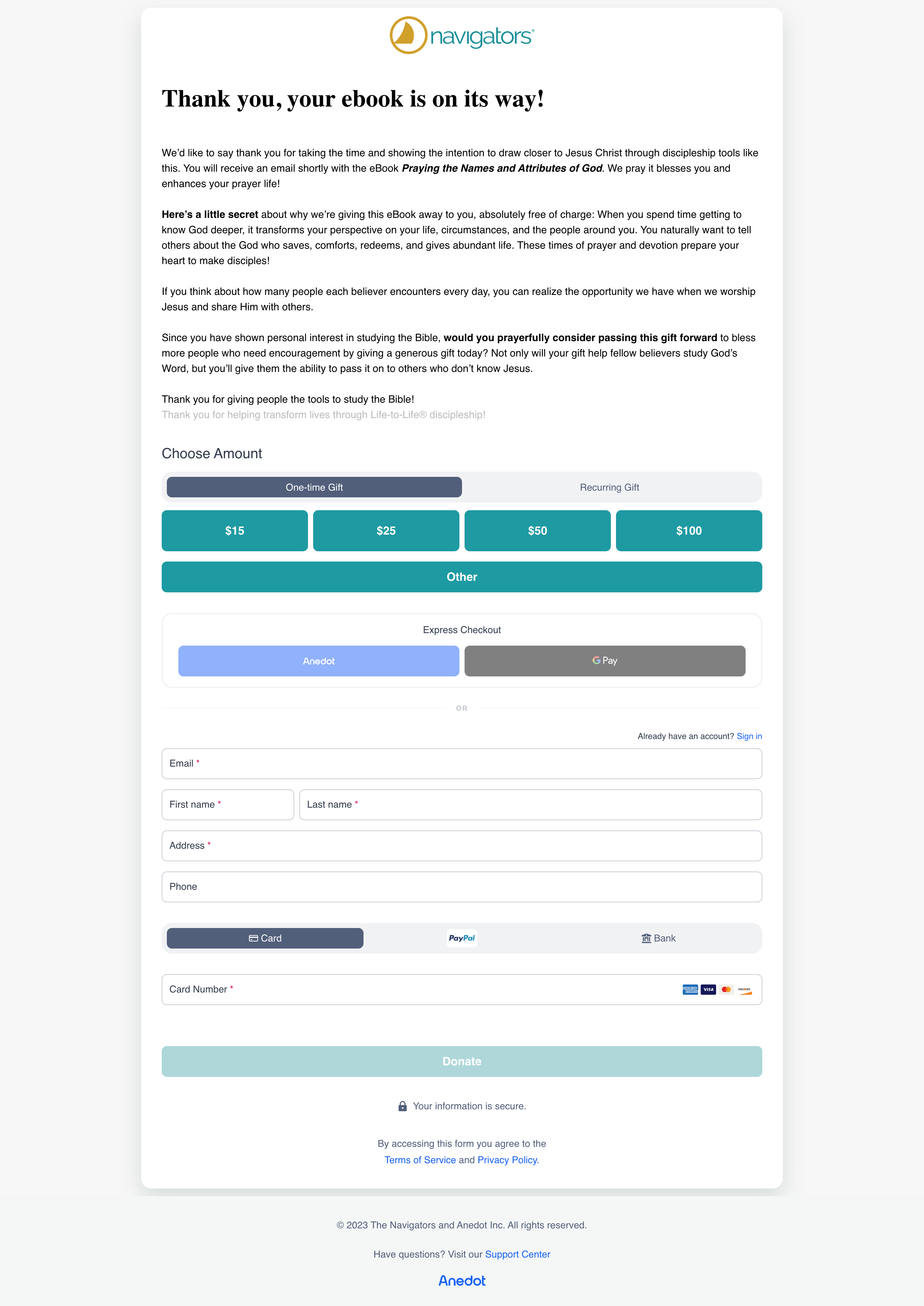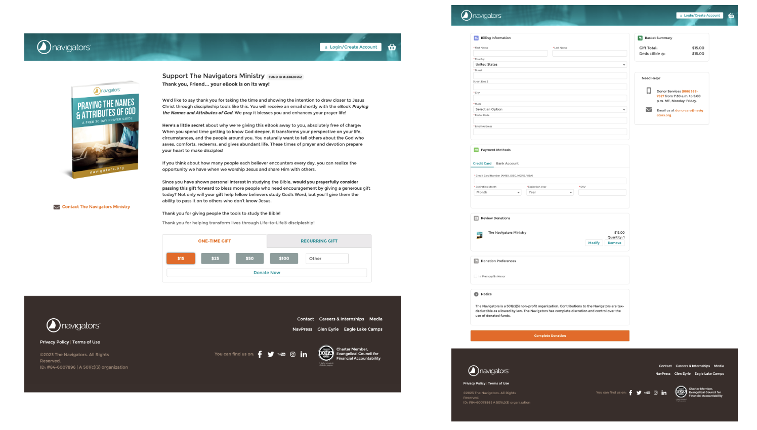 In a previous experiment, the Navigators successfully increased donor conversion rate by reducing the number of steps in the giving process from 3 to 2. Our hypothesis was that we would reduce even more friction in the giving process by consolidating the experience into a single page. Unfortunately, the organization’s current giving platform was not able to accommodate a single step giving experience. Therefore, we used a completely different platform for this experiment’s treatment. We kept the control as-is in its current platform and the treatment on a new platform as a single-page experience.