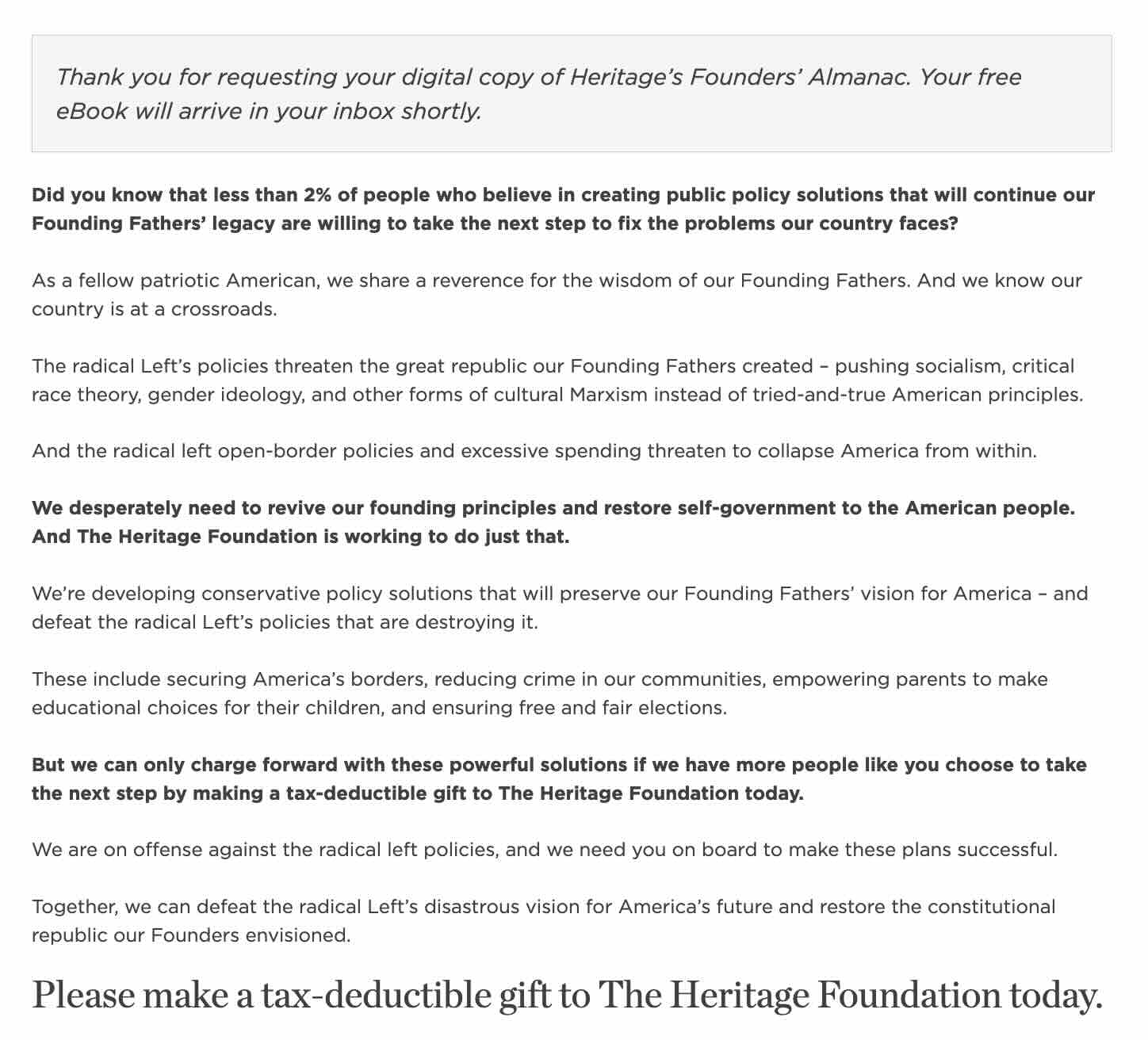 The Heritage Foundation was running a campaign where visitors could sign up to receive an eBook version of their Founders Almanac book. After signing up to receive the free eBook, visitors were redirected to a donation page where they could choose to give a gift.