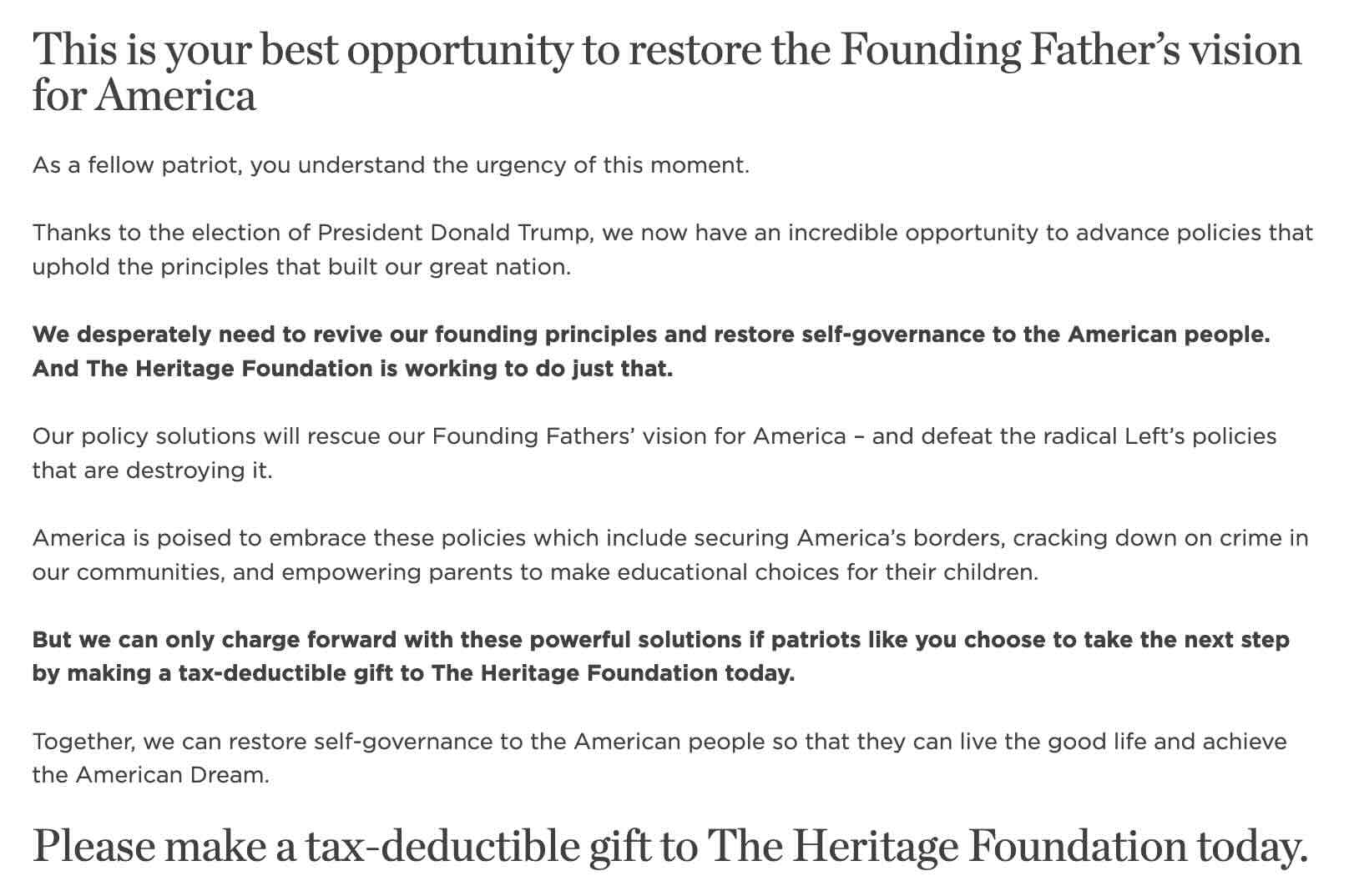 In an effort to increase donor conversion rate on the donation page, and in response to the changing landscape of American policy following the presidential election, they wanted to test whether updated page copy referencing the incoming Trump administration and the work that Heritage can do because of it leads to this increase.