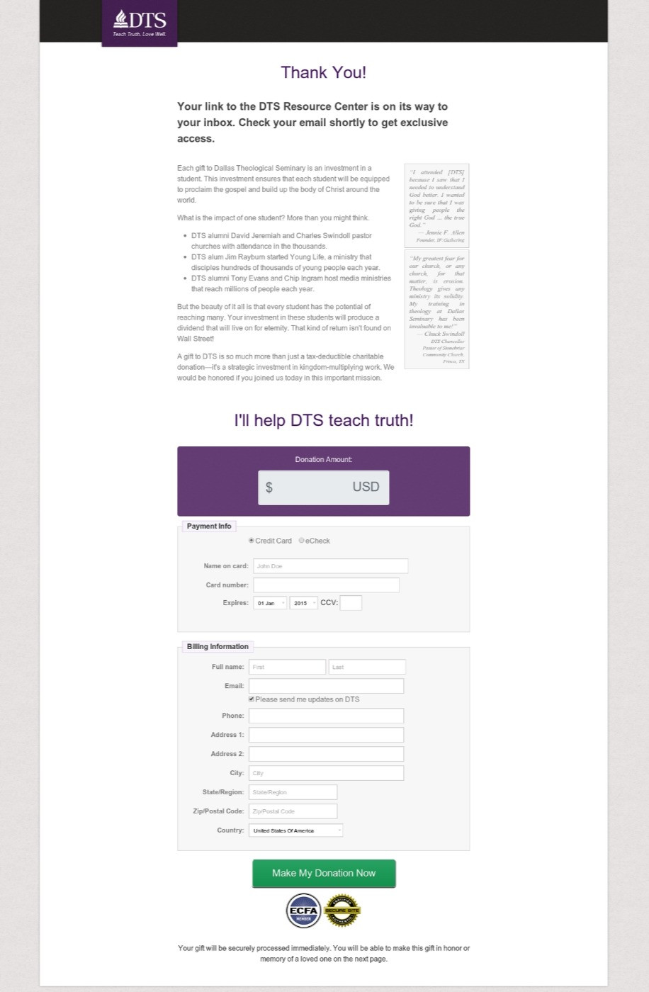 Dallas Theological Seminary launched a resource center for biblical perspectives on today’s issues. The goal of this resource center was email and donor acquisition. Immediately after the signup page was a donation ask.