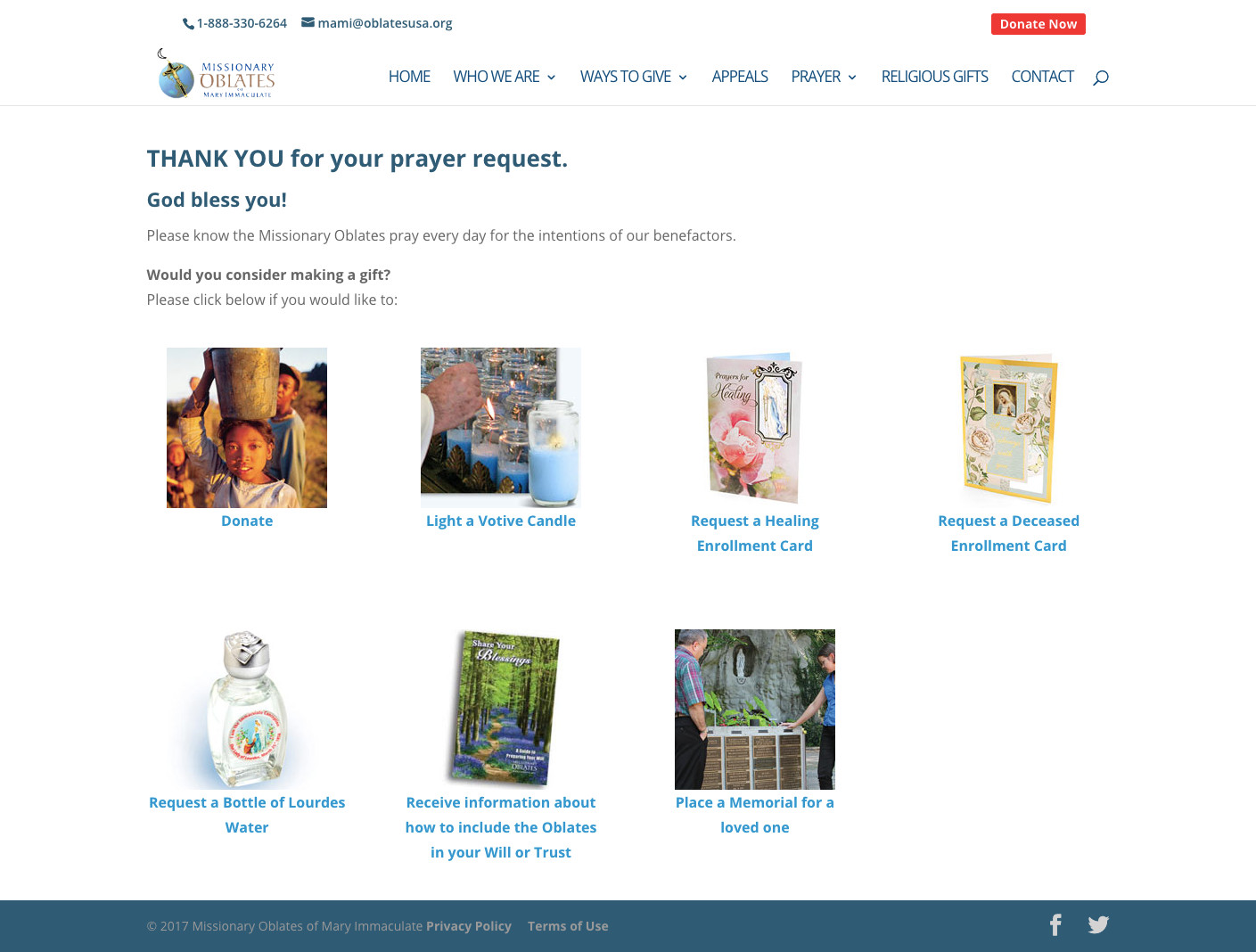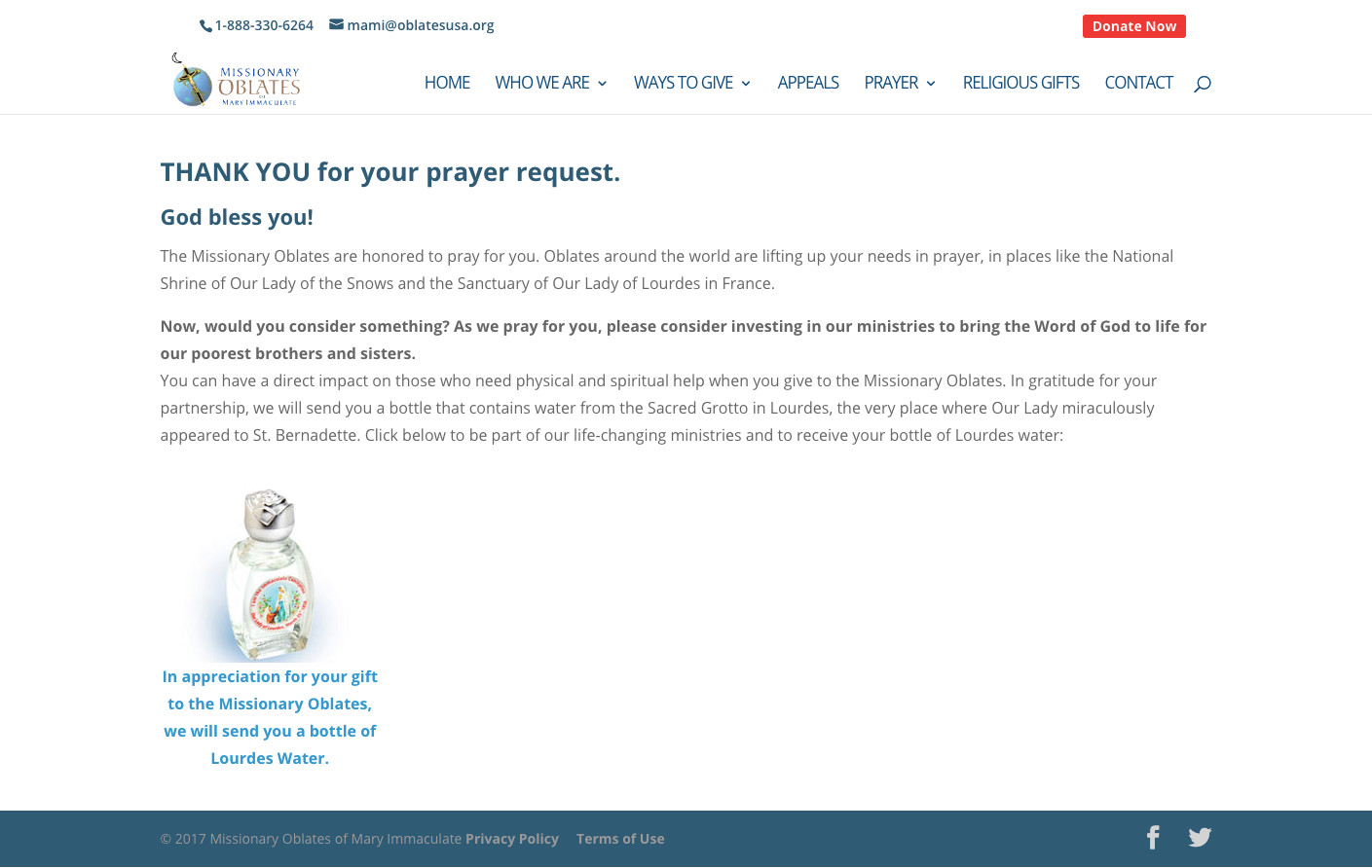 The Missionary Oblates have a place on their website that allows people to submit a prayer request. After submitting their request, they are taken to a page with a donate button, along with 6 other options for premiums. In an earlier test where they tested the multiple options versus just one option – donate – they decreased donor conversion on the page. In analyzing the experiment they hypothesized that maybe the one option that they chose to offer wasn’t the right kind of offer. To continue to test into this, they hypothesized testing the multiple offers again versus one of the more popular offers – the Lourdes water. They also added value proposition to the page communicating the action they wanted people to take after submitting their prayer request and the benefit of that action and the offer.