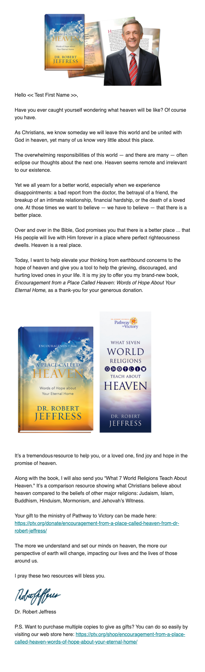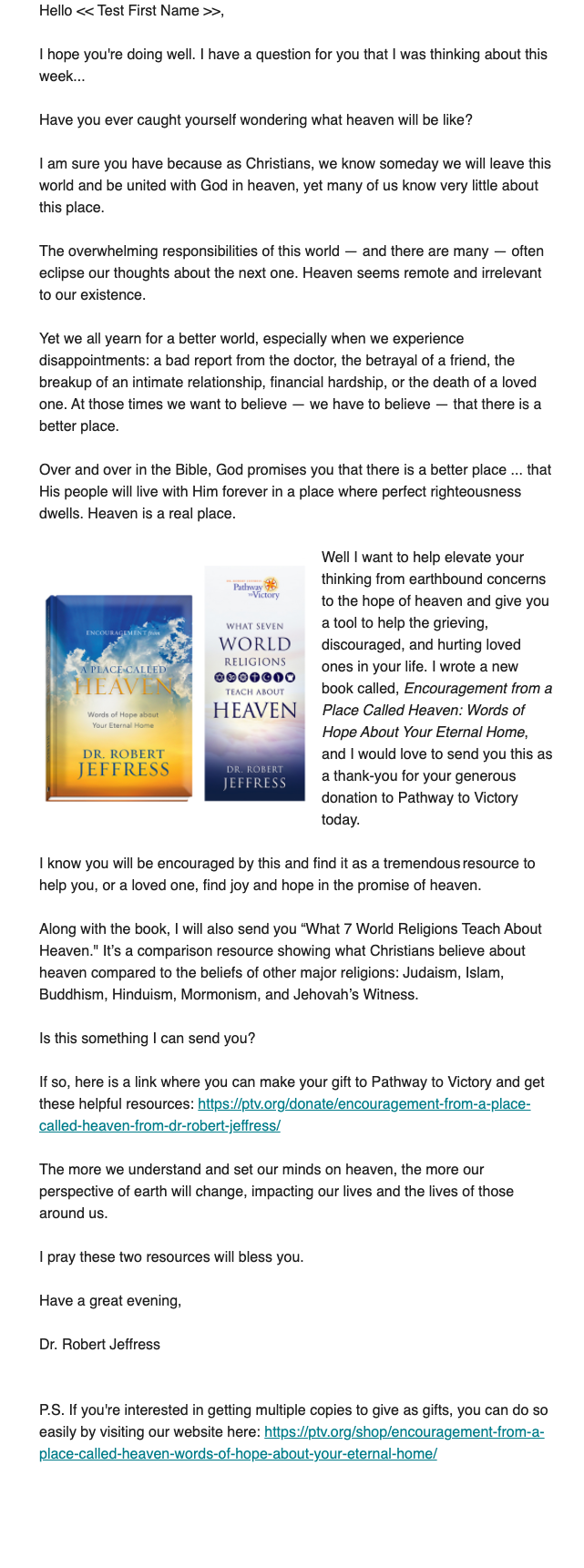 Encouragement for a Place Called Heaven was a special premium appeal sent to a select number of constituents of Pathway to Victory. As part of our ongoing testing of what appeals to a very premium-focused audience, especially in light of the war in Ukraine, we tested removing images and humanizing the copy.