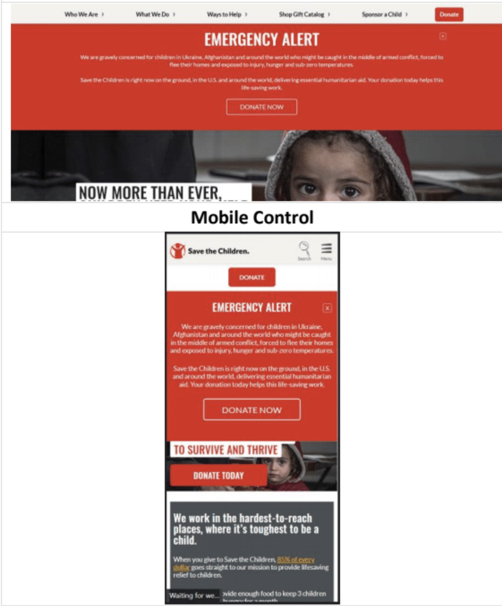 We believe that adding an emergency slider with a clear CTA to the homepage for potential donors will achieve a greater response than the emergency banner because it moves the page and dynamically loads an equivalent goal.