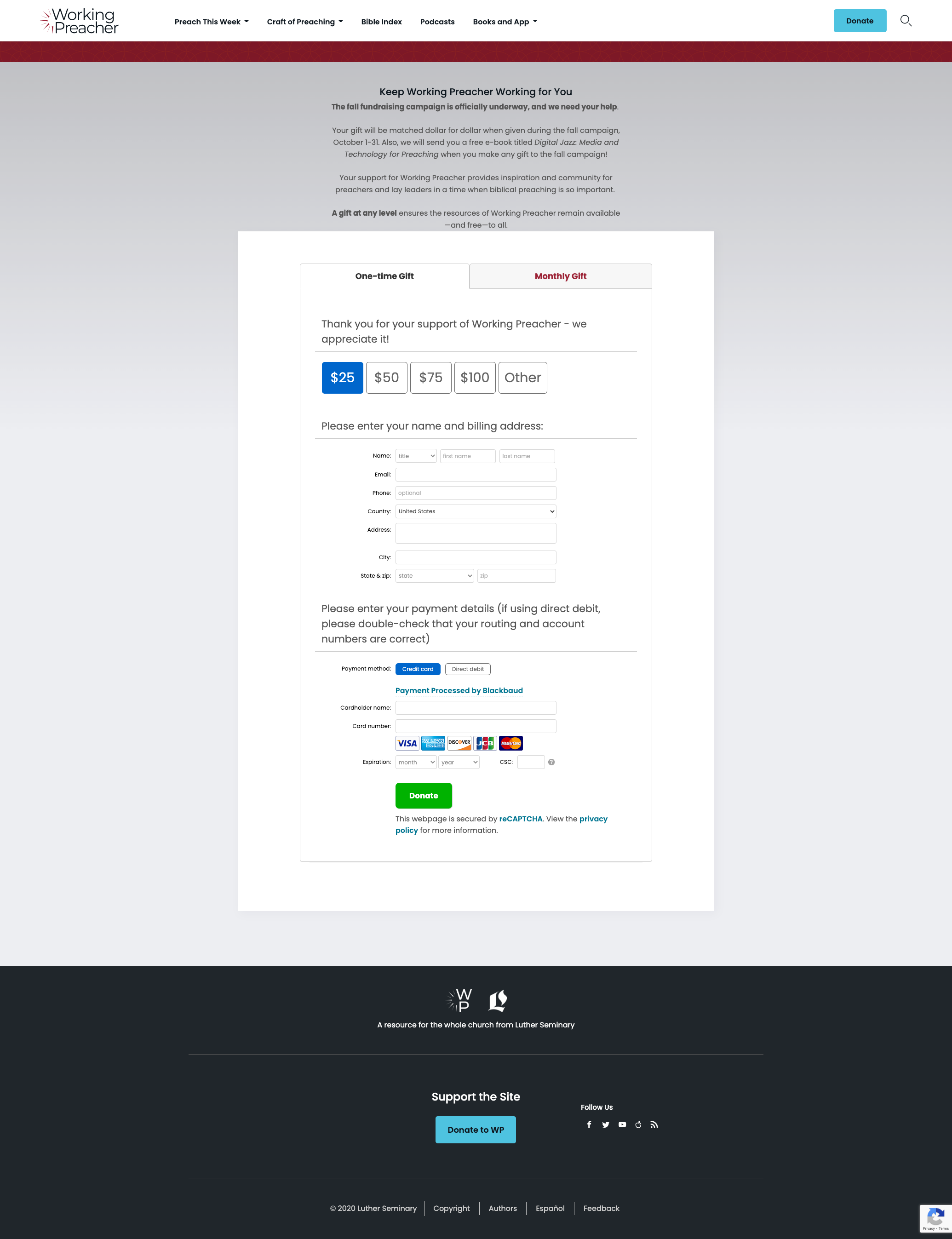 They wanted to test building a completely separate campaign donation that has more value proposition on why someone should give to the Working Preacher campaign and what Working Preacher will do for you (the donor).