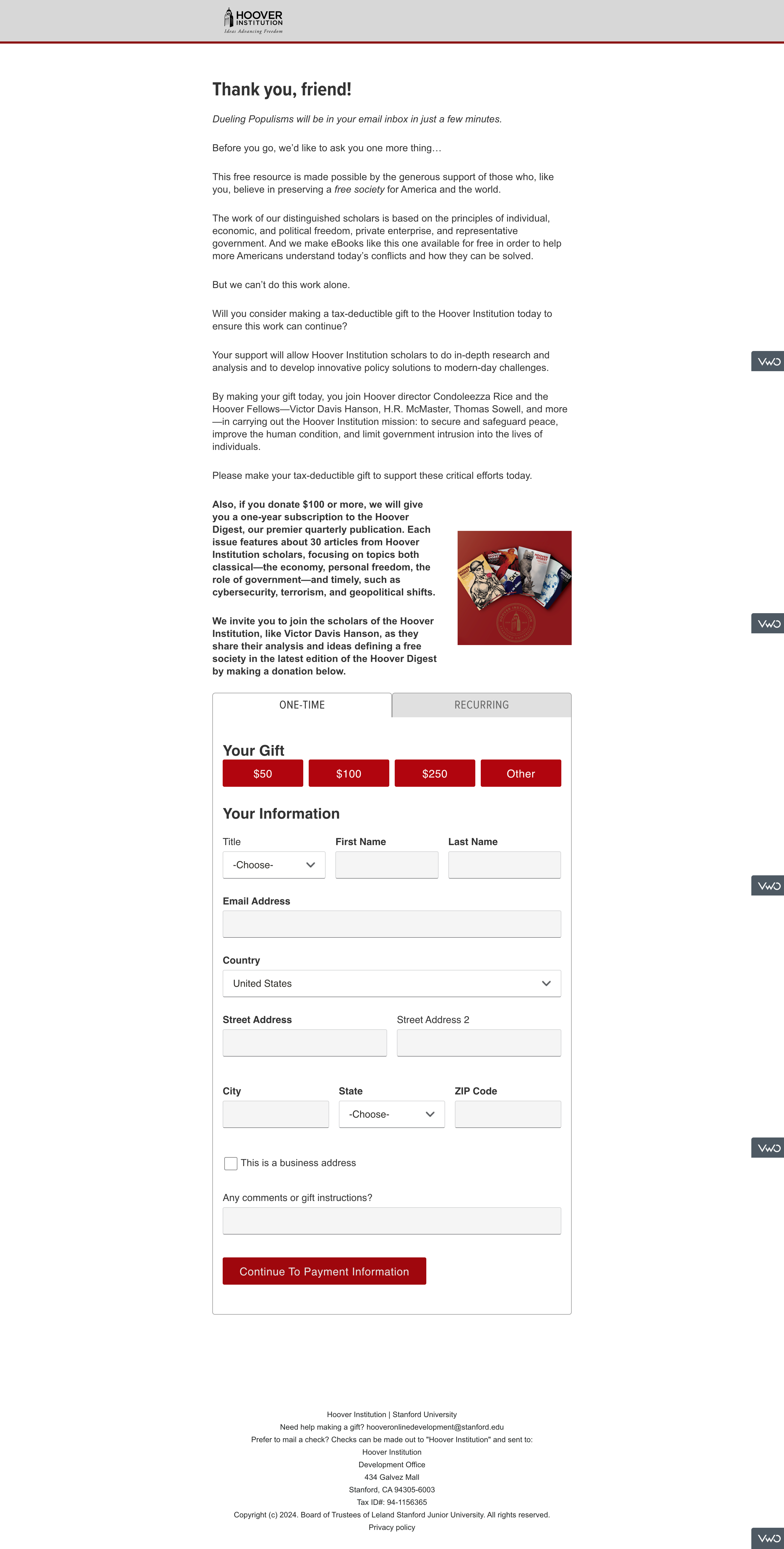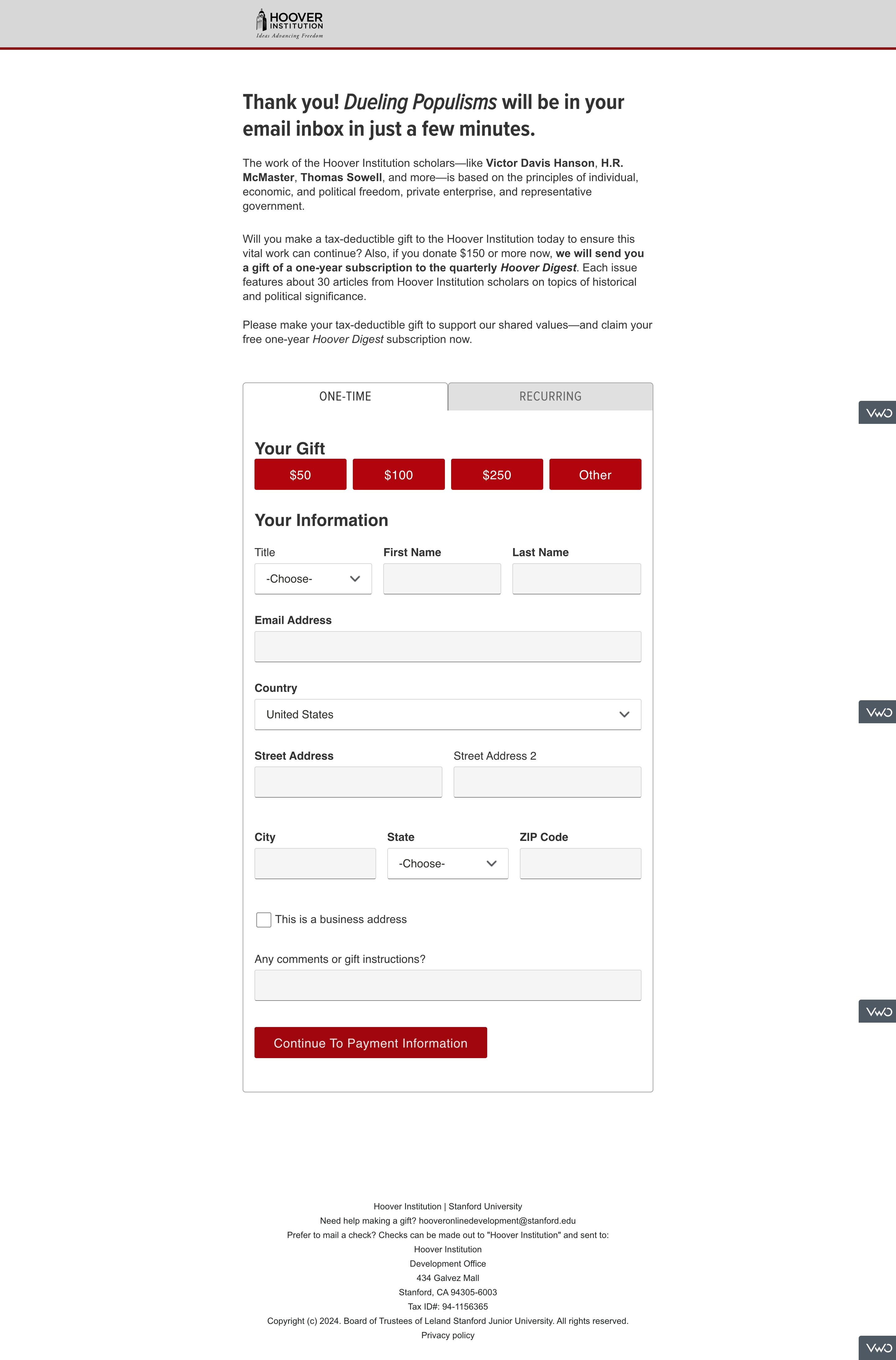 The Hoover Institution is a public policy research center and think tank located at Stanford University in California, United States. For one of their longest-running offers, Dueling Populisms, we wanted to test whether shortening the copy on an instant donation page would impact donor conversion rates. The hypothesis was that a donor would have already read a long email and long landing page to get to the instant donation page, therefore we were reducing friction by limiting the amount of copy they needed to read.