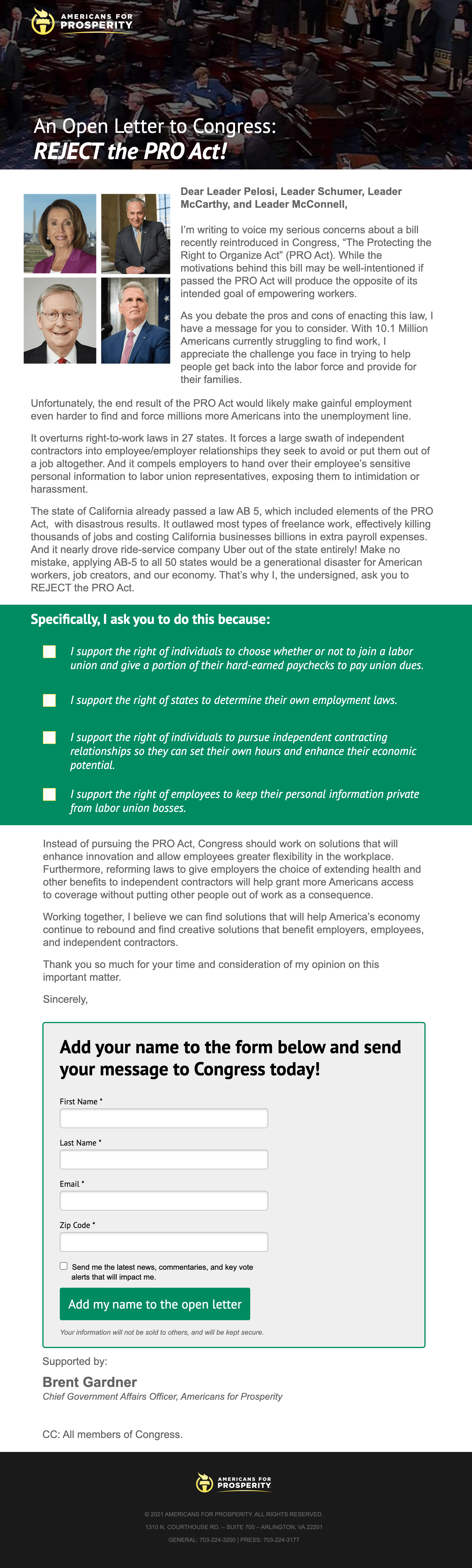 As a part of an open letter (petition) promotional campaign that Americans for Prosperity was running, they wanted to see if they could experiment with increasing email signup rates on the massive increases in click-through traffic received from their simplified ad approach.
