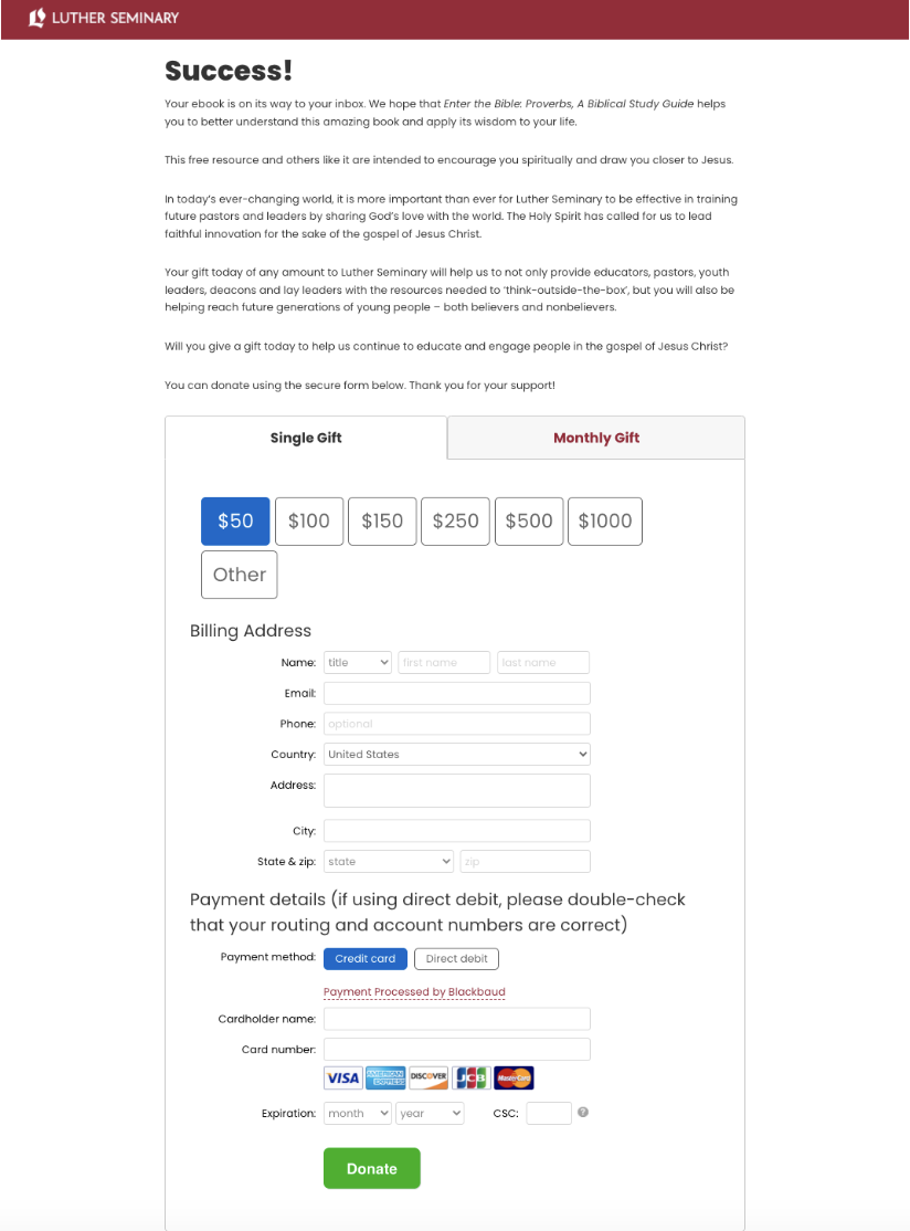 Luther Seminary has been running paid Facebook ads and email marketing for their content offer Enter the Bible: Revelation Study Guide. While the email sign-up rate was healthy around 48%, we wanted to try and increase the instant conversion rate on the donation page.