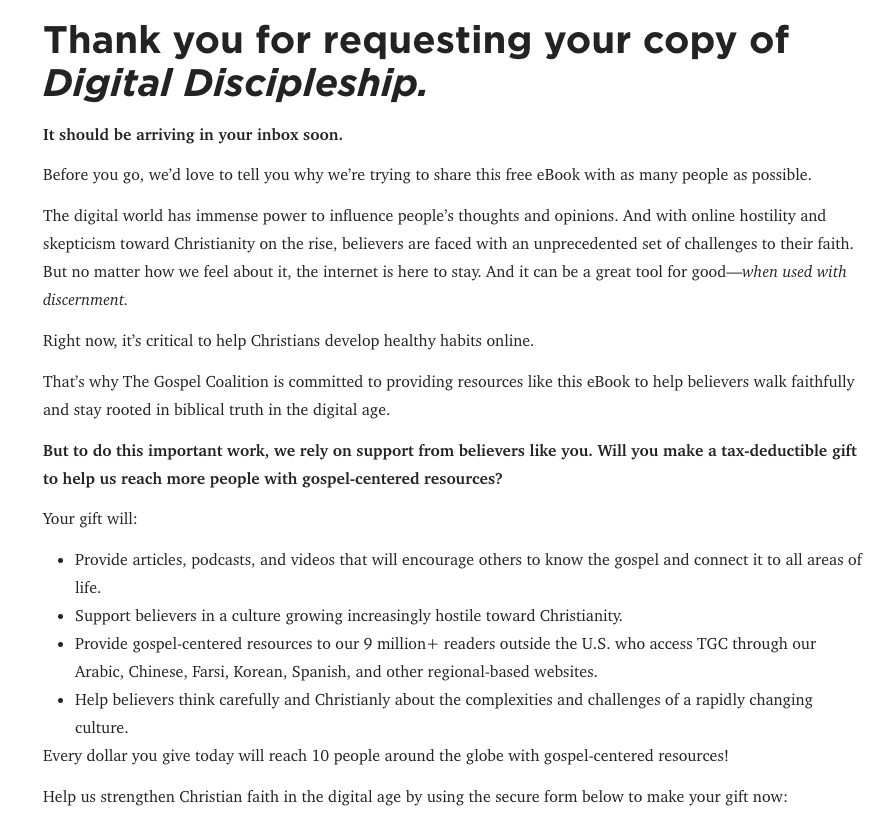 TGC’s Digital Discipleship eBook funnel was producing a low instant conversion rate. Users that reached the instant donation page after signing up to receive the eBook were making donations at a rate well below the benchmark. We came across a TGC video that we thought did an excellent job of highlighting our cause and what we’re hoping to accomplish. So we transcribed it, and transferred the three important things stated in the video into the instant donation page copy for this offer. We wondered if diverting from the traditional copy format on the donation page and structuring the copy in a more user-friendly manner would increase donor conversion rate.